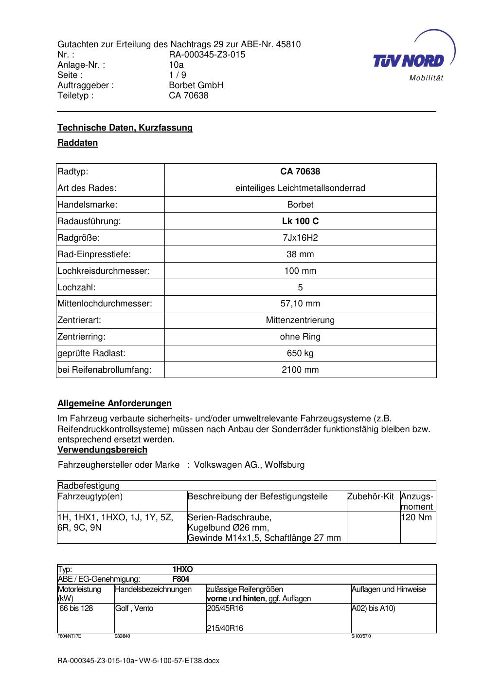 Dieses Gutachten (abe) bezieht sich auf die Alufelge Borbet CA 70638 in der Ausführung 7Jx16 ET 0, Mittenloch 0 mm (KBA 45810). Im PDF findest du typischerweise zulässige Reifengrößen, Auflagen/Anbauhinweise und – je nach Dokument – Hinweise zur Eintragung.