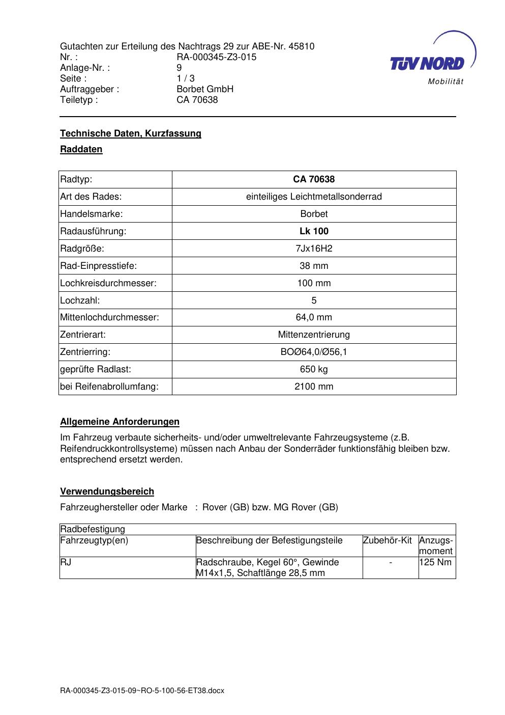 Dieses Gutachten (abe) bezieht sich auf die Alufelge Borbet CA 70638 in der Ausführung 7Jx16 ET 0, Mittenloch 0 mm (KBA 45810). Im PDF findest du typischerweise zulässige Reifengrößen, Auflagen/Anbauhinweise und – je nach Dokument – Hinweise zur Eintragung.