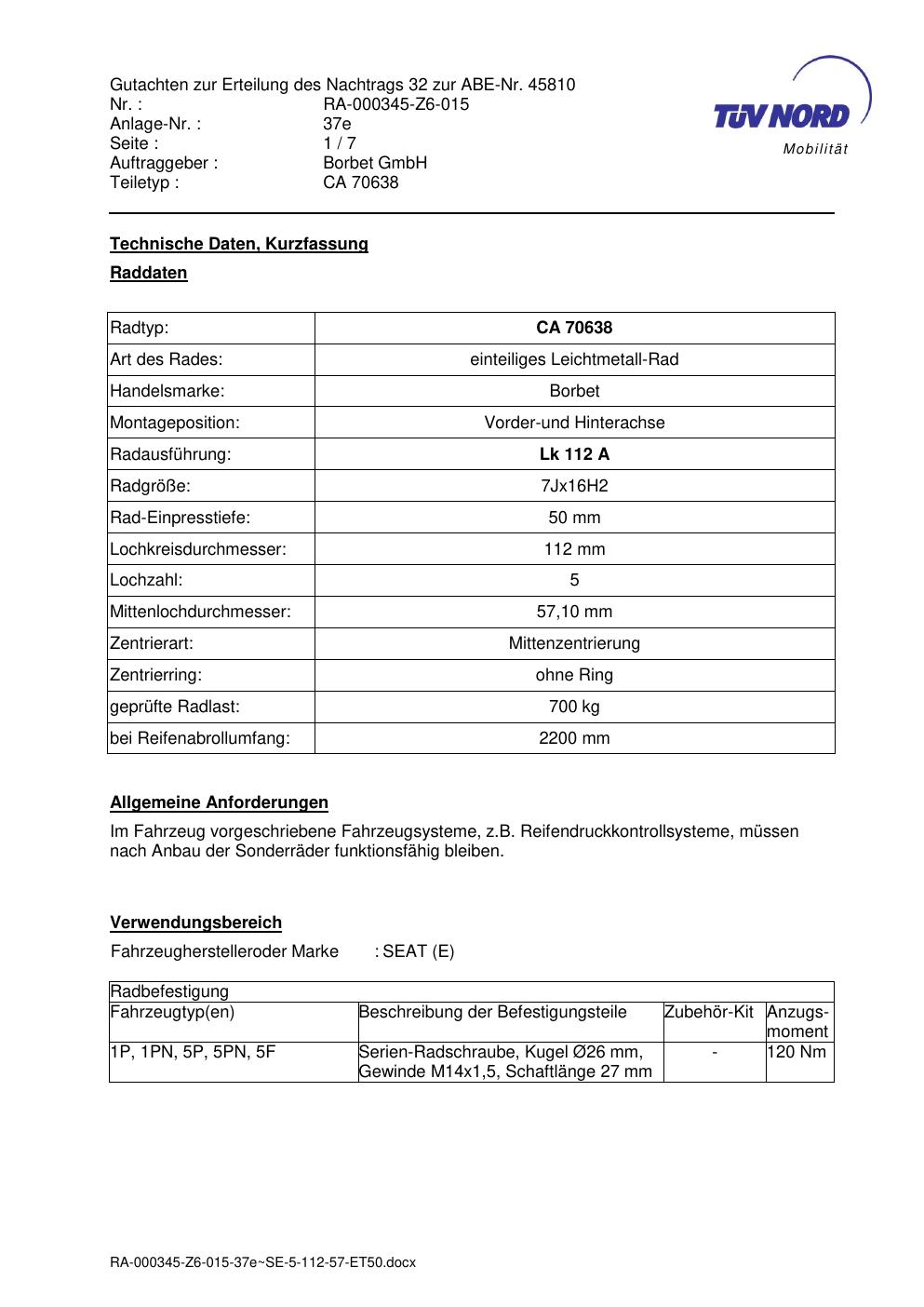 Dieses Gutachten (abe) bezieht sich auf die Alufelge Borbet CA 70638 in der Ausführung 7Jx16 ET 0, Mittenloch 0 mm (KBA 45810). Im PDF findest du typischerweise zulässige Reifengrößen, Auflagen/Anbauhinweise und – je nach Dokument – Hinweise zur Eintragung.