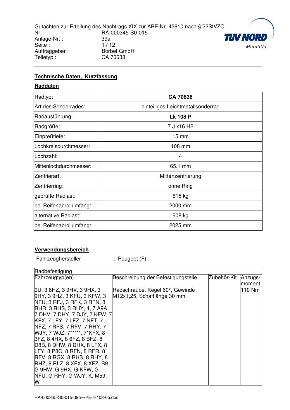 Dieses Gutachten (abe) bezieht sich auf die Alufelge Borbet CA 70638 in der Ausführung 7Jx16 ET 0, Mittenloch 0 mm (KBA 45810). Im PDF findest du typischerweise zulässige Reifengrößen, Auflagen/Anbauhinweise und – je nach Dokument – Hinweise zur Eintragung.