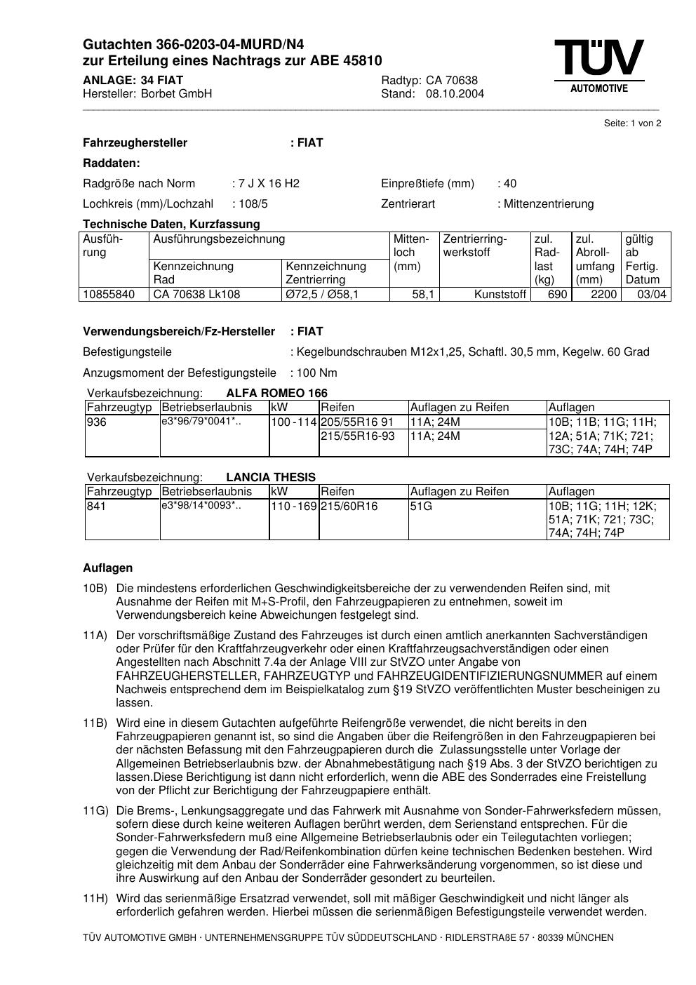 Dieses Gutachten (abe) bezieht sich auf die Alufelge brand-borbet CA 70638 in der Ausführung 7Jx16 ET 0, Mittenloch 0 mm (KBA 45810). Im PDF findest du typischerweise zulässige Reifengrößen, Auflagen/Anbauhinweise und – je nach Dokument – Hinweise zur Eintragung.
