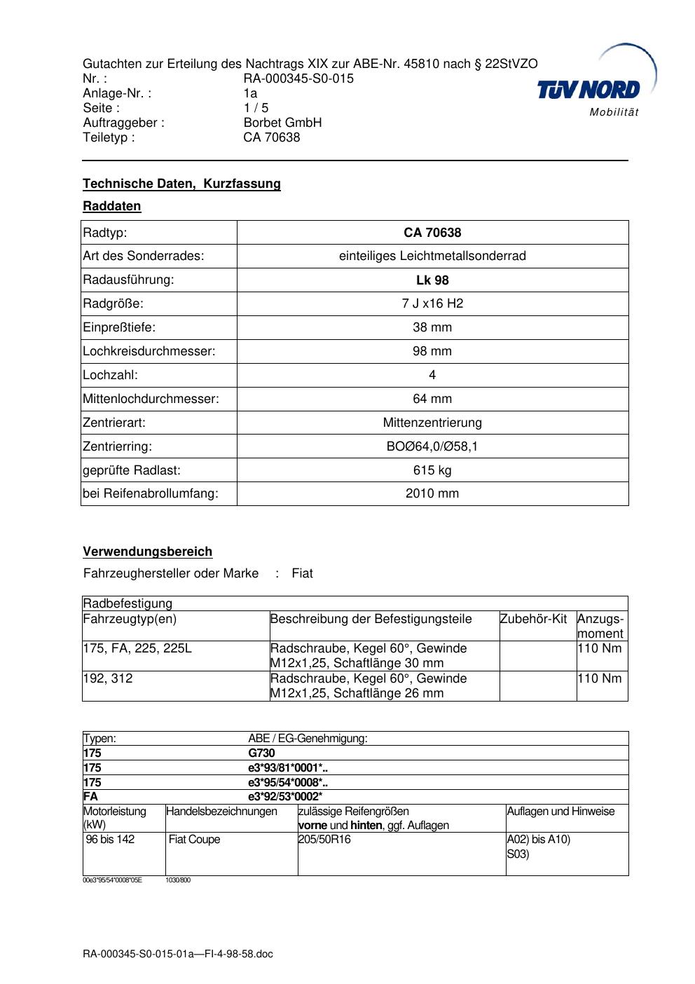 Dieses Gutachten (abe) bezieht sich auf die Alufelge Borbet CA 70638 in der Ausführung 7Jx16 ET 0, Mittenloch 0 mm (KBA 45810). Im PDF findest du typischerweise zulässige Reifengrößen, Auflagen/Anbauhinweise und – je nach Dokument – Hinweise zur Eintragung.