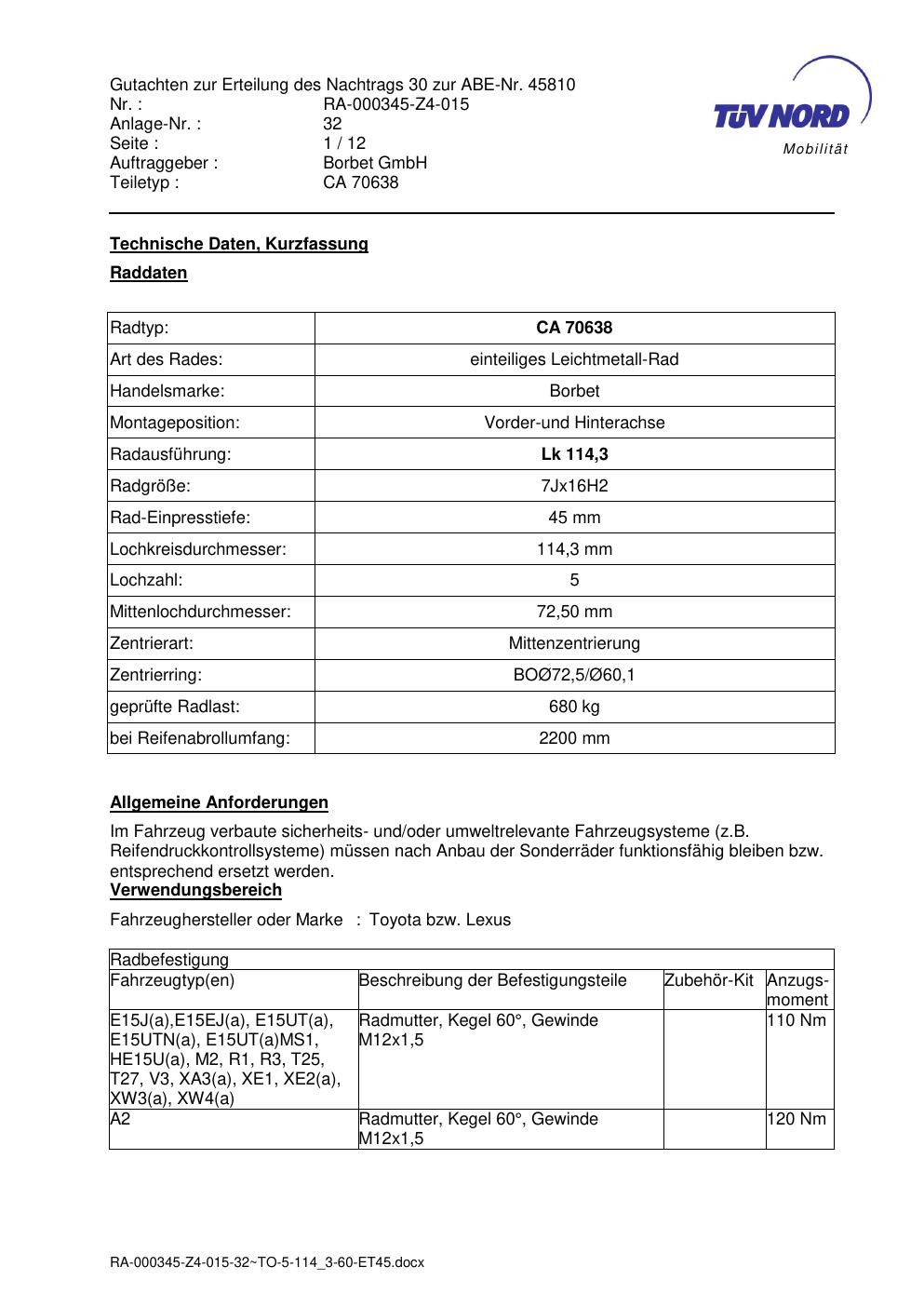 Dieses Gutachten (abe) bezieht sich auf die Alufelge Borbet CA 70638 in der Ausführung 7Jx16 ET 0, Mittenloch 0 mm (KBA 45810). Im PDF findest du typischerweise zulässige Reifengrößen, Auflagen/Anbauhinweise und – je nach Dokument – Hinweise zur Eintragung.
