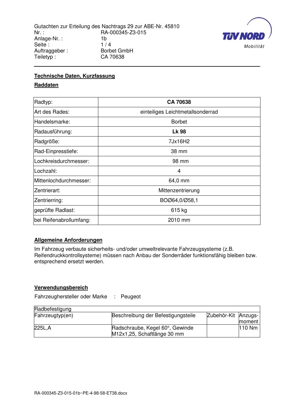 Dieses Gutachten (abe) bezieht sich auf die Alufelge Borbet CA 70638 in der Ausführung 7Jx16 ET 0, Mittenloch 0 mm (KBA 45810). Im PDF findest du typischerweise zulässige Reifengrößen, Auflagen/Anbauhinweise und – je nach Dokument – Hinweise zur Eintragung.