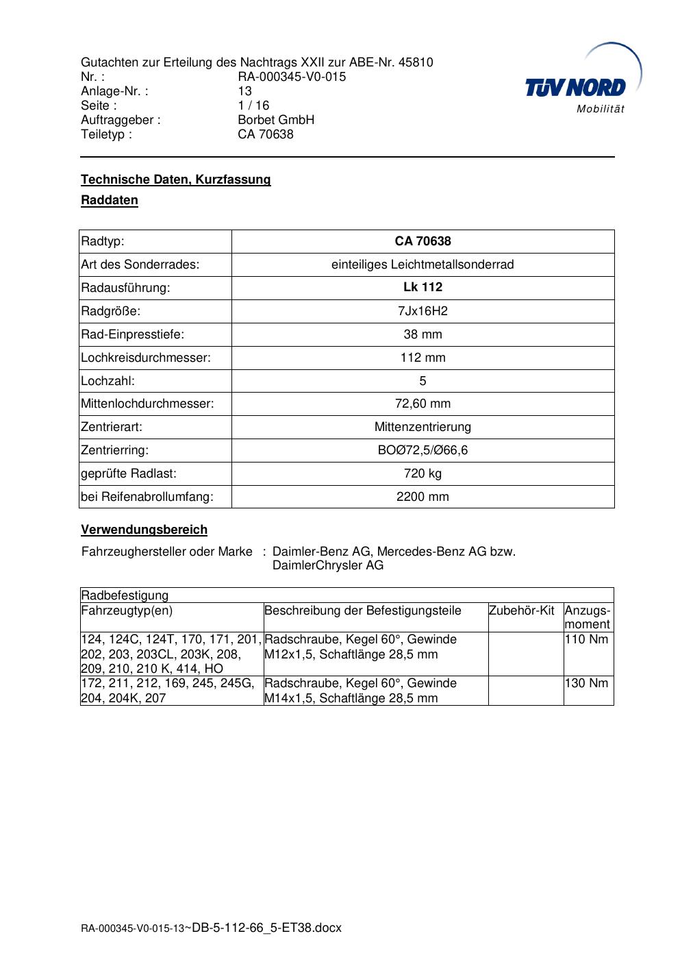 Dieses Gutachten (abe) bezieht sich auf die Alufelge Borbet CA 70638 in der Ausführung 7Jx16 ET 0, Mittenloch 0 mm (KBA 45810). Im PDF findest du typischerweise zulässige Reifengrößen, Auflagen/Anbauhinweise und – je nach Dokument – Hinweise zur Eintragung.