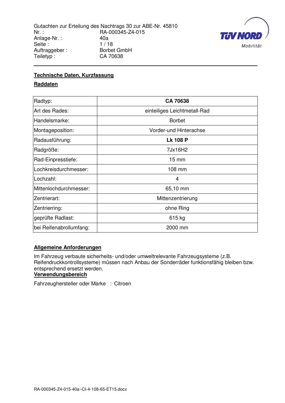 Dieses Gutachten (abe) bezieht sich auf die Alufelge Borbet CA 70638 in der Ausführung 7Jx16 ET 0, Mittenloch 0 mm (KBA 45810). Im PDF findest du typischerweise zulässige Reifengrößen, Auflagen/Anbauhinweise und – je nach Dokument – Hinweise zur Eintragung.