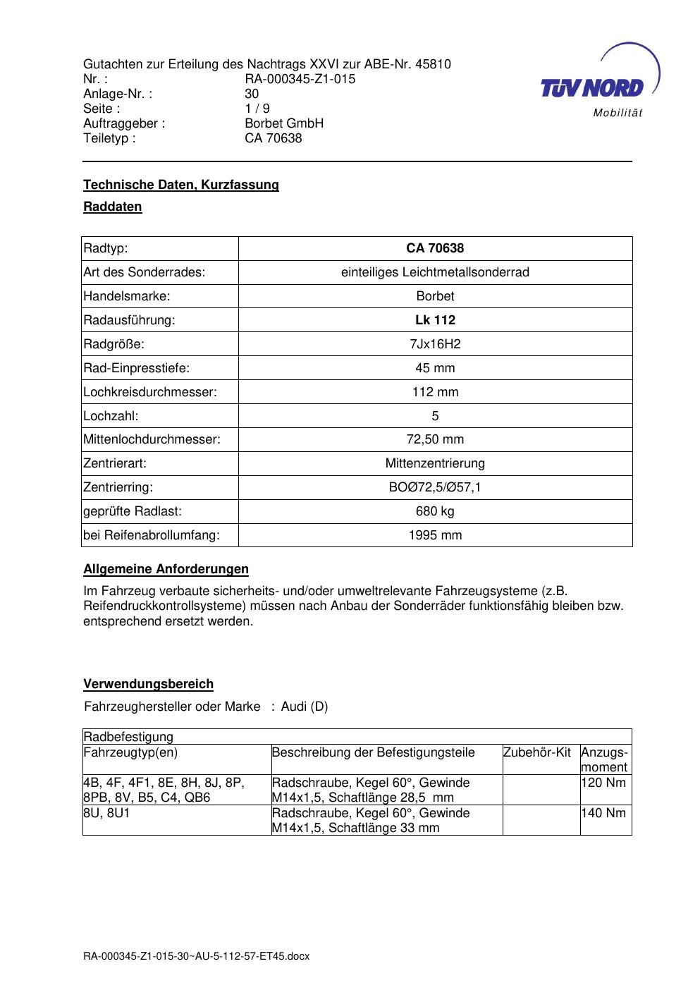 Dieses Gutachten (abe) bezieht sich auf die Alufelge Borbet CA 70638 in der Ausführung 7Jx16 ET 0, Mittenloch 0 mm (KBA 45810). Im PDF findest du typischerweise zulässige Reifengrößen, Auflagen/Anbauhinweise und – je nach Dokument – Hinweise zur Eintragung.