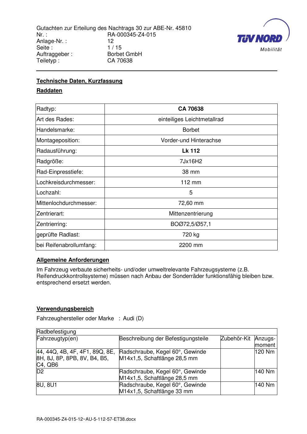 Dieses Gutachten (abe) bezieht sich auf die Alufelge Borbet CA 70638 in der Ausführung 7Jx16 ET 0, Mittenloch 0 mm (KBA 45810). Im PDF findest du typischerweise zulässige Reifengrößen, Auflagen/Anbauhinweise und – je nach Dokument – Hinweise zur Eintragung.
