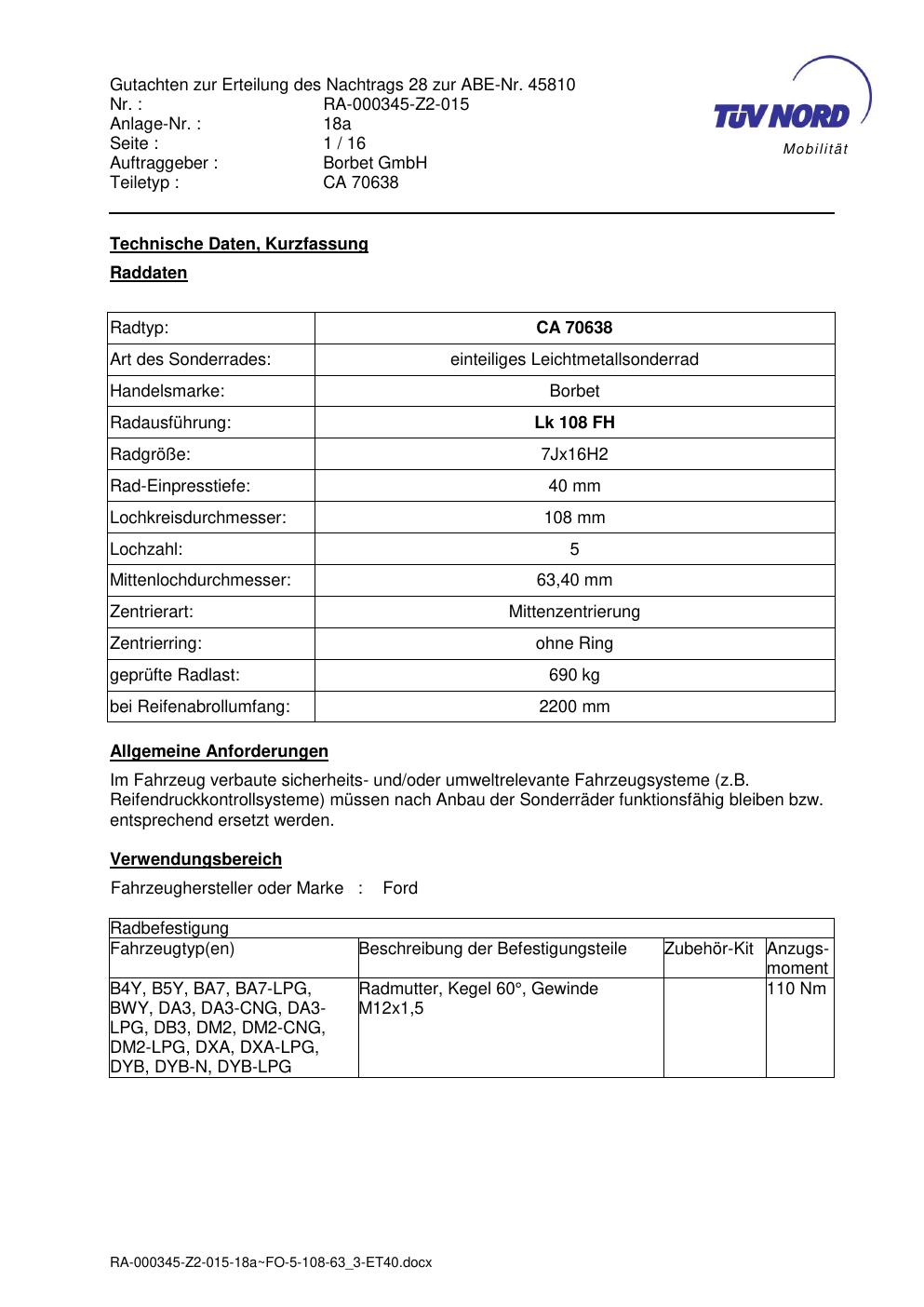 Dieses Gutachten (abe) bezieht sich auf die Alufelge Borbet CA 70638 in der Ausführung 7Jx16 ET 0, Mittenloch 0 mm (KBA 45810). Im PDF findest du typischerweise zulässige Reifengrößen, Auflagen/Anbauhinweise und – je nach Dokument – Hinweise zur Eintragung.