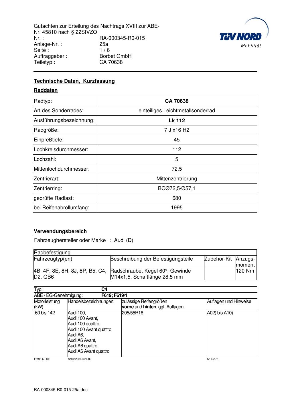 Dieses Gutachten (abe) bezieht sich auf die Alufelge Borbet CA 70638 in der Ausführung 7Jx16 ET 0, Mittenloch 0 mm (KBA 45810). Im PDF findest du typischerweise zulässige Reifengrößen, Auflagen/Anbauhinweise und – je nach Dokument – Hinweise zur Eintragung.