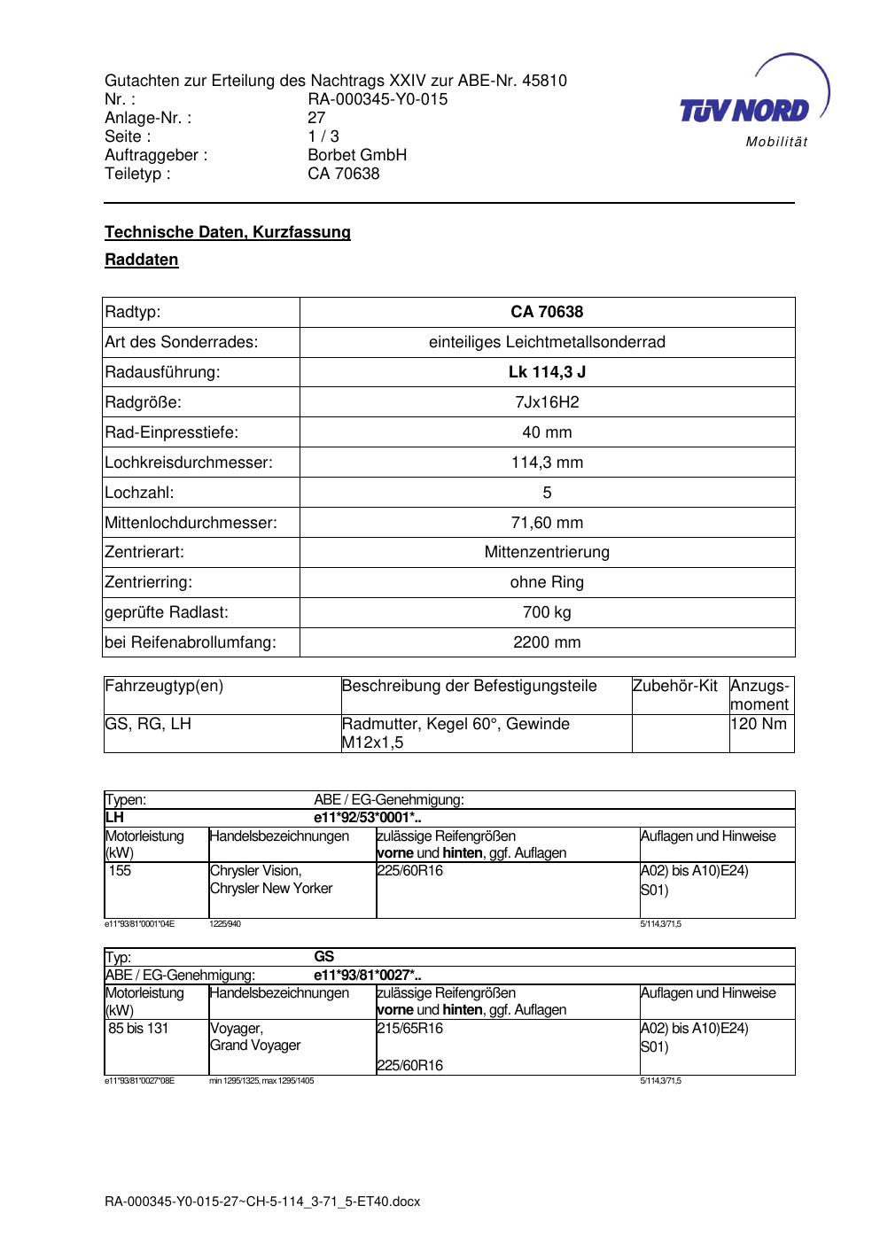 Dieses Gutachten (abe) bezieht sich auf die Alufelge Borbet CA 70638 in der Ausführung 7Jx16 ET 0, Mittenloch 0 mm (KBA 45810). Im PDF findest du typischerweise zulässige Reifengrößen, Auflagen/Anbauhinweise und – je nach Dokument – Hinweise zur Eintragung.