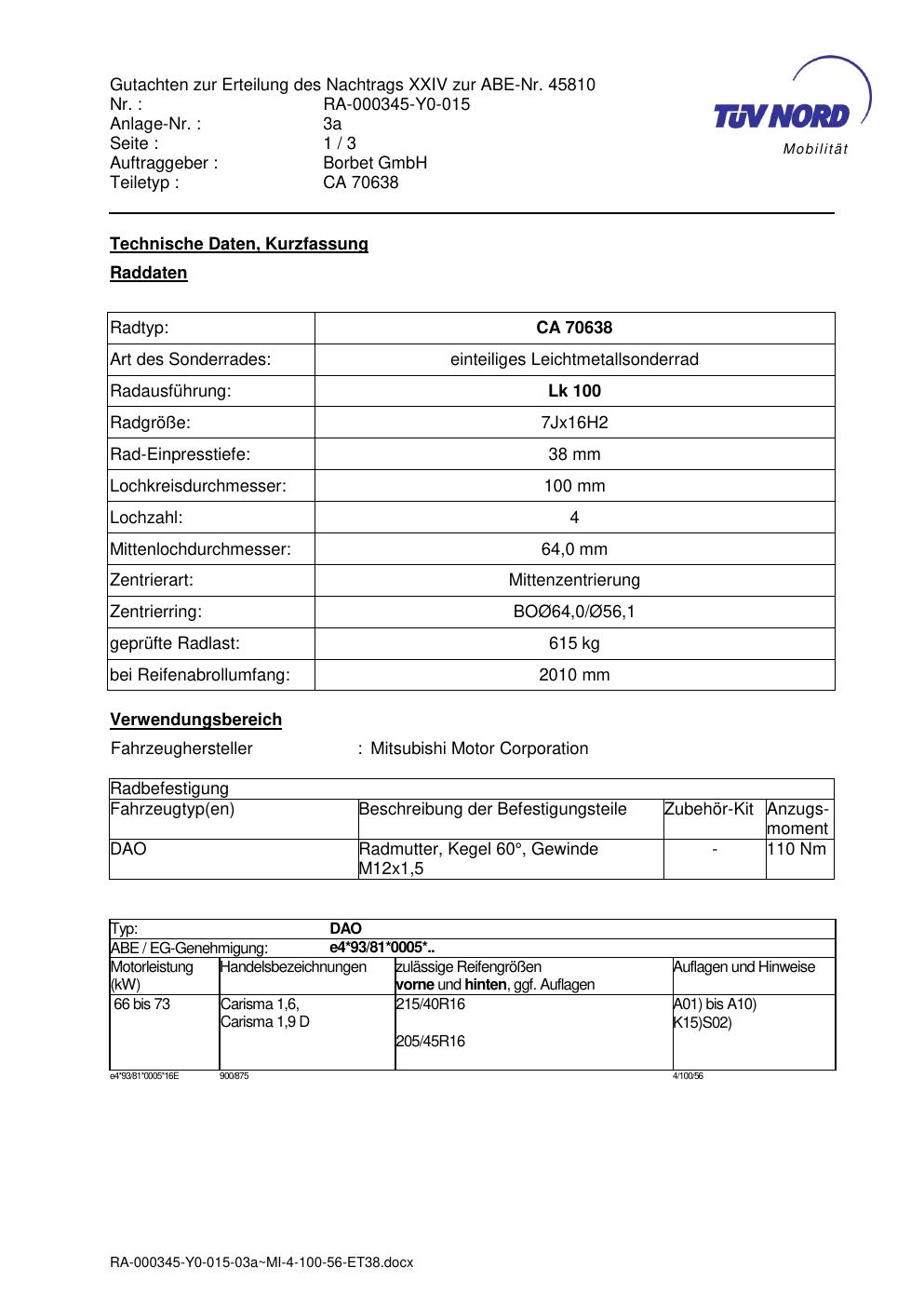 Dieses Gutachten (abe) bezieht sich auf die Alufelge Borbet CA 70638 in der Ausführung 7Jx16 ET 0, Mittenloch 0 mm (KBA 45810). Im PDF findest du typischerweise zulässige Reifengrößen, Auflagen/Anbauhinweise und – je nach Dokument – Hinweise zur Eintragung.