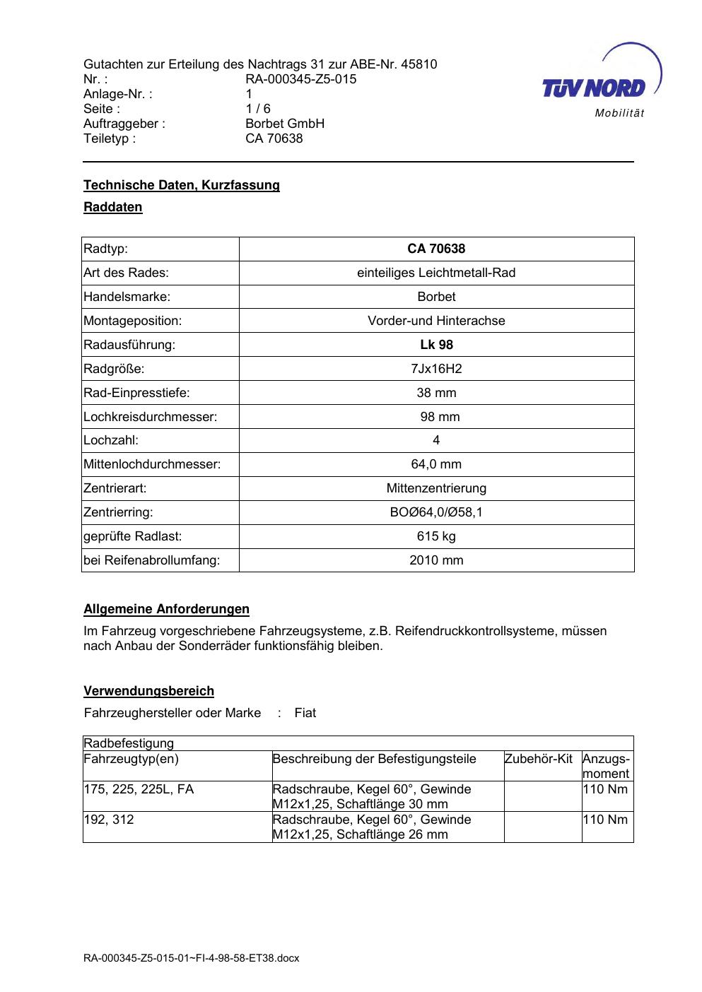 Dieses Gutachten (abe) bezieht sich auf die Alufelge Borbet CA 70638 in der Ausführung 7Jx16 ET 0, Mittenloch 0 mm (KBA 45810). Im PDF findest du typischerweise zulässige Reifengrößen, Auflagen/Anbauhinweise und – je nach Dokument – Hinweise zur Eintragung.