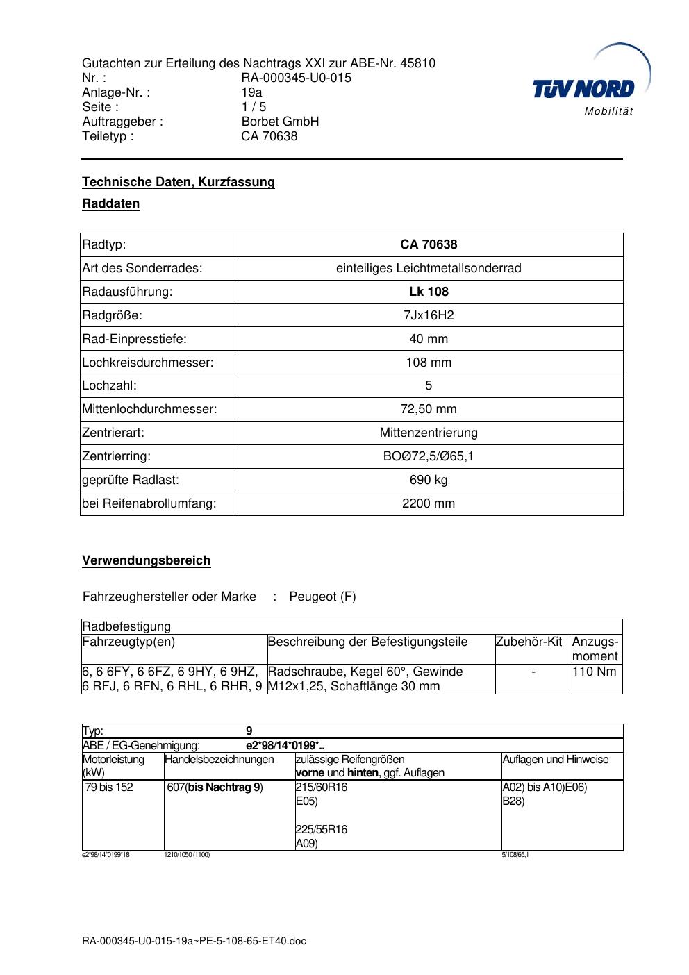 Dieses Gutachten (abe) bezieht sich auf die Alufelge Borbet CA 70638 in der Ausführung 7Jx16 ET 0, Mittenloch 0 mm (KBA 45810). Im PDF findest du typischerweise zulässige Reifengrößen, Auflagen/Anbauhinweise und – je nach Dokument – Hinweise zur Eintragung.