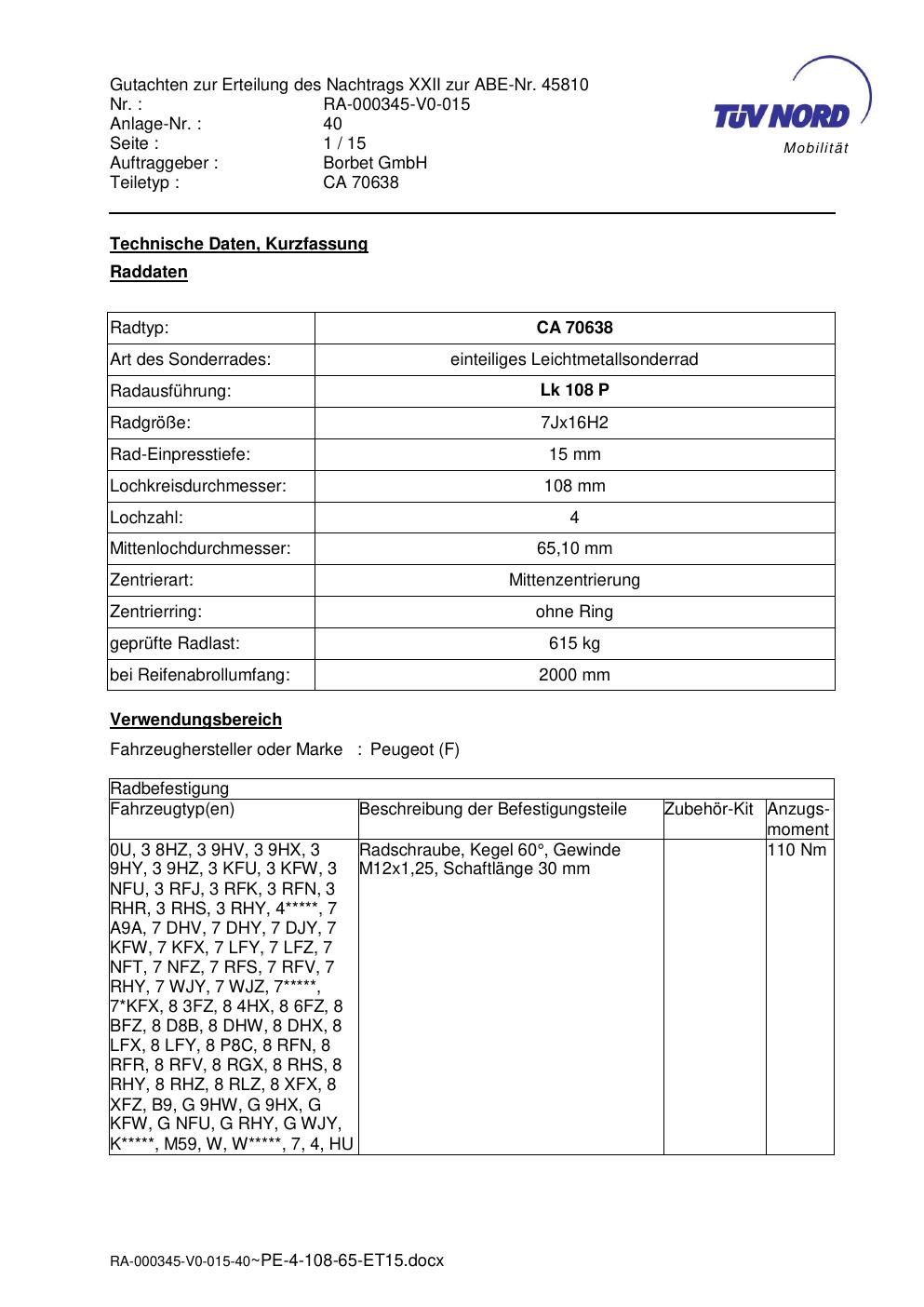 Dieses Gutachten (abe) bezieht sich auf die Alufelge Borbet CA 70638 in der Ausführung 7Jx16 ET 0, Mittenloch 0 mm (KBA 45810). Im PDF findest du typischerweise zulässige Reifengrößen, Auflagen/Anbauhinweise und – je nach Dokument – Hinweise zur Eintragung.
