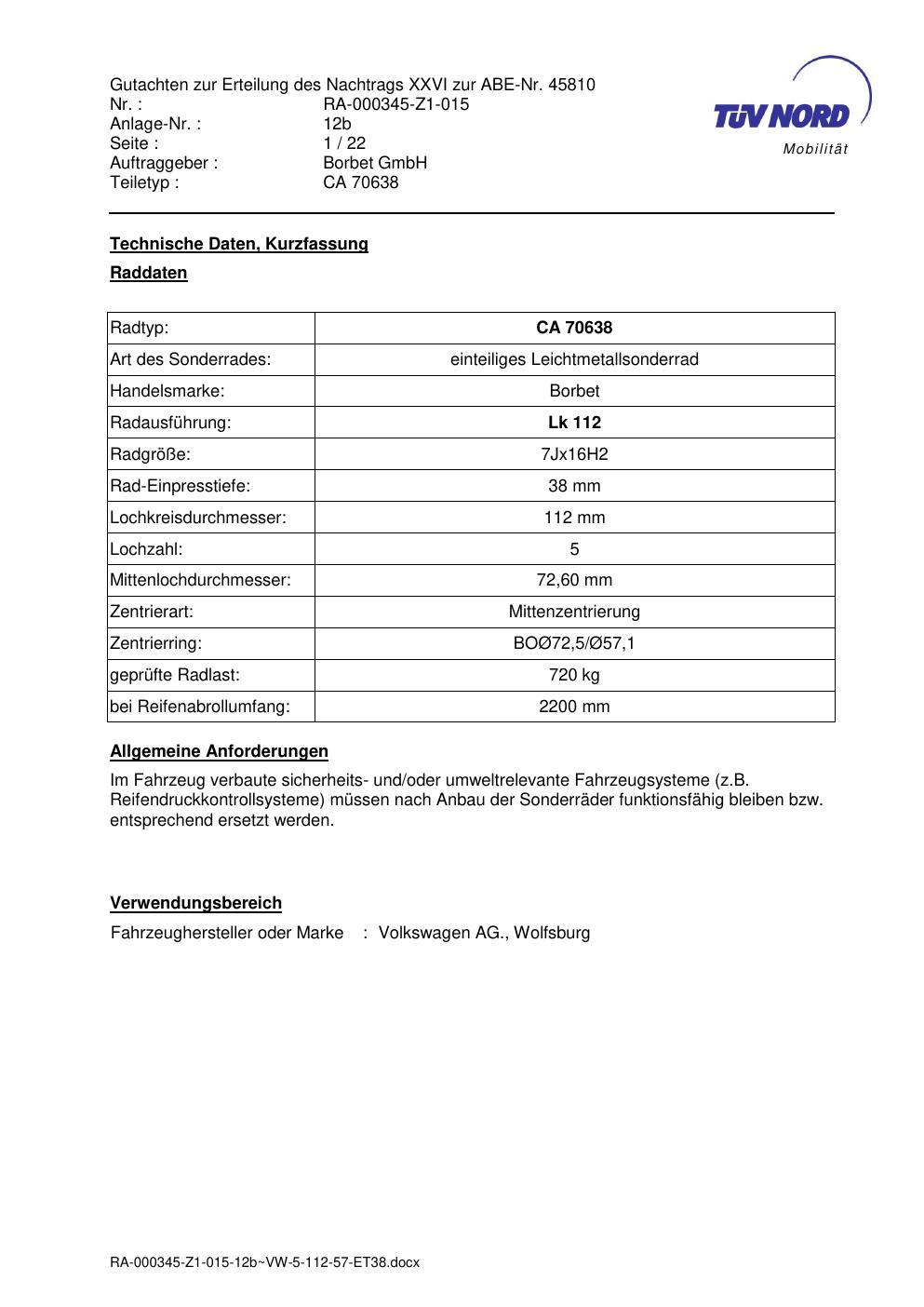 Dieses Gutachten (abe) bezieht sich auf die Alufelge Borbet CA 70638 in der Ausführung 7Jx16 ET 0, Mittenloch 0 mm (KBA 45810). Im PDF findest du typischerweise zulässige Reifengrößen, Auflagen/Anbauhinweise und – je nach Dokument – Hinweise zur Eintragung.