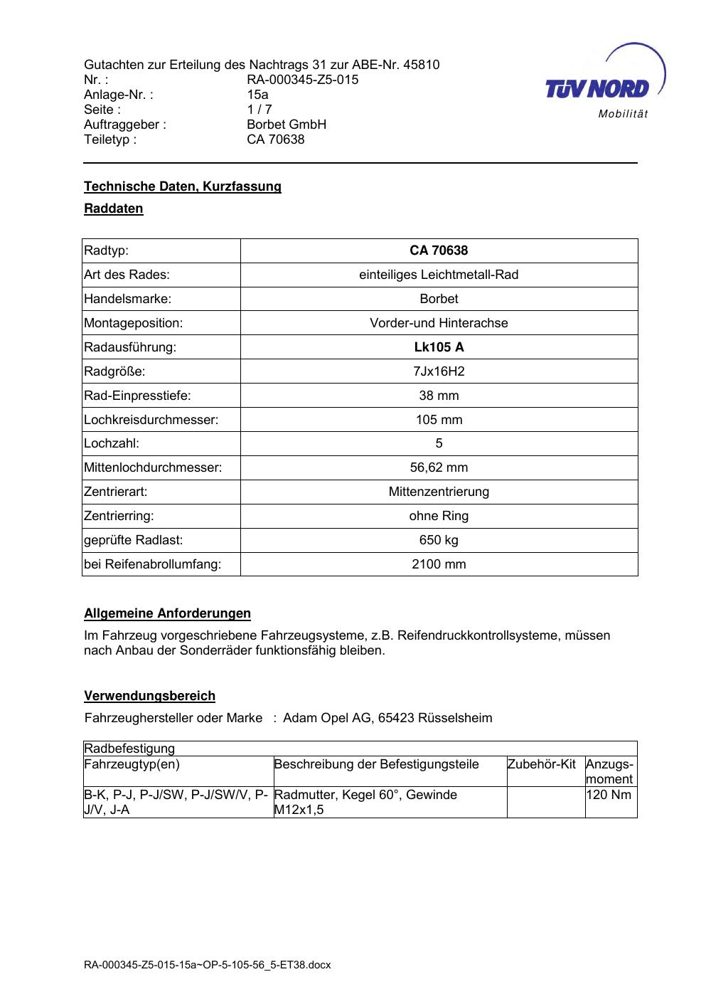 Dieses Gutachten (abe) bezieht sich auf die Alufelge brand-borbet CA 70638 in der Ausführung 7Jx16 ET 0, Mittenloch 0 mm (KBA 45810). Im PDF findest du typischerweise zulässige Reifengrößen, Auflagen/Anbauhinweise und – je nach Dokument – Hinweise zur Eintragung.