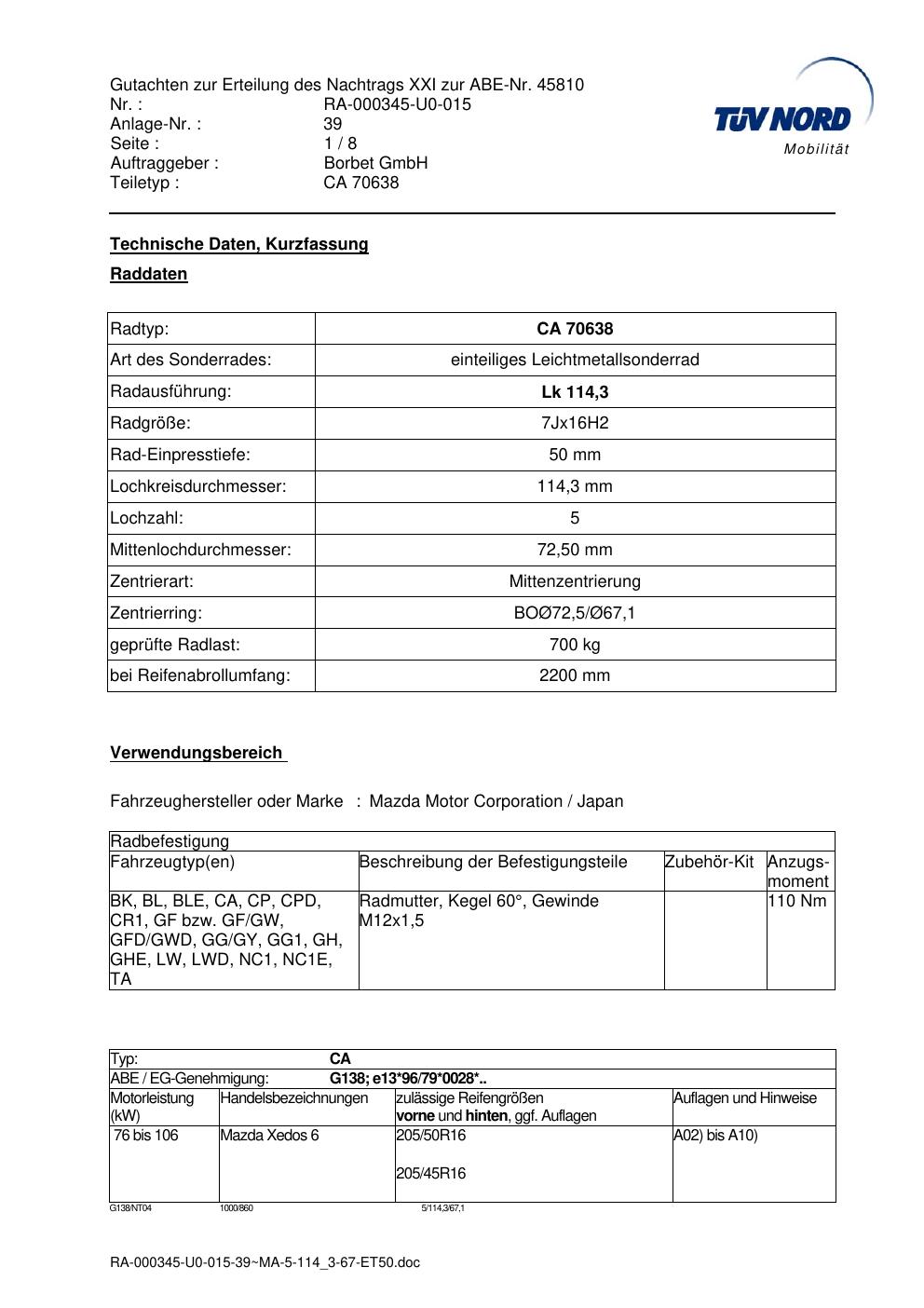 Dieses Gutachten (abe) bezieht sich auf die Alufelge Borbet CA 70638 in der Ausführung 7Jx16 ET 0, Mittenloch 0 mm (KBA 45810). Im PDF findest du typischerweise zulässige Reifengrößen, Auflagen/Anbauhinweise und – je nach Dokument – Hinweise zur Eintragung.