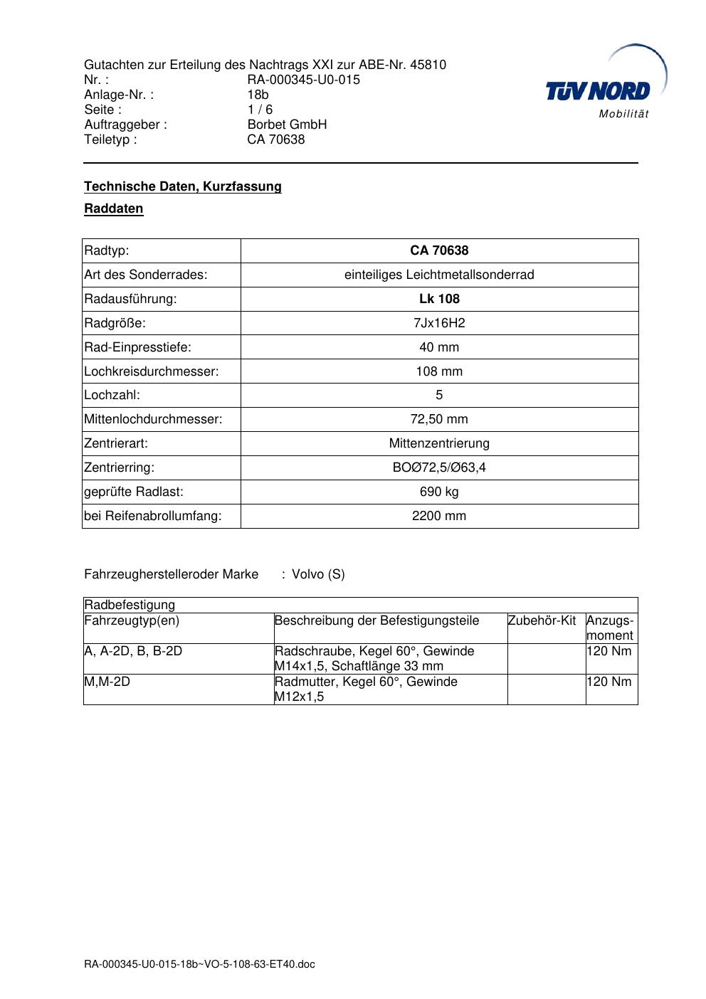 Dieses Gutachten (abe) bezieht sich auf die Alufelge Borbet CA 70638 in der Ausführung 7Jx16 ET 0, Mittenloch 0 mm (KBA 45810). Im PDF findest du typischerweise zulässige Reifengrößen, Auflagen/Anbauhinweise und – je nach Dokument – Hinweise zur Eintragung.