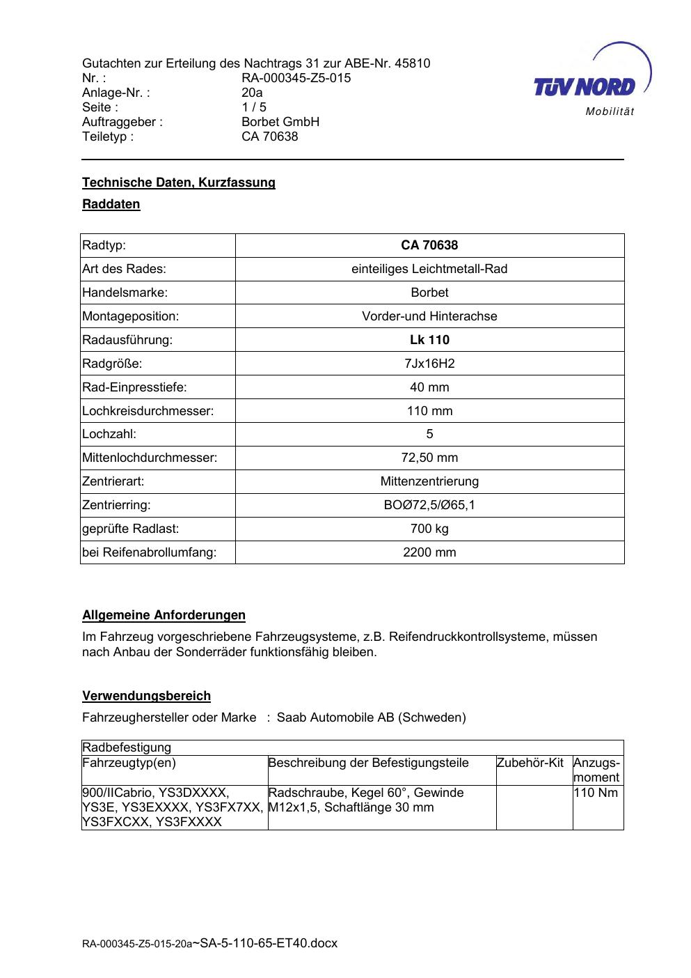 Dieses Gutachten (abe) bezieht sich auf die Alufelge Borbet CA 70638 in der Ausführung 7Jx16 ET 0, Mittenloch 0 mm (KBA 45810). Im PDF findest du typischerweise zulässige Reifengrößen, Auflagen/Anbauhinweise und – je nach Dokument – Hinweise zur Eintragung.