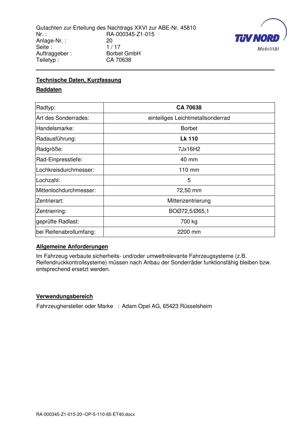 Dieses Gutachten (abe) bezieht sich auf die Alufelge Borbet CA 70638 in der Ausführung 7Jx16 ET 0, Mittenloch 0 mm (KBA 45810). Im PDF findest du typischerweise zulässige Reifengrößen, Auflagen/Anbauhinweise und – je nach Dokument – Hinweise zur Eintragung.