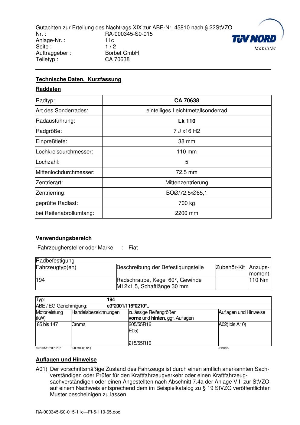 Dieses Gutachten (abe) bezieht sich auf die Alufelge Borbet CA 70638 in der Ausführung 7Jx16 ET 0, Mittenloch 0 mm (KBA 45810). Im PDF findest du typischerweise zulässige Reifengrößen, Auflagen/Anbauhinweise und – je nach Dokument – Hinweise zur Eintragung.
