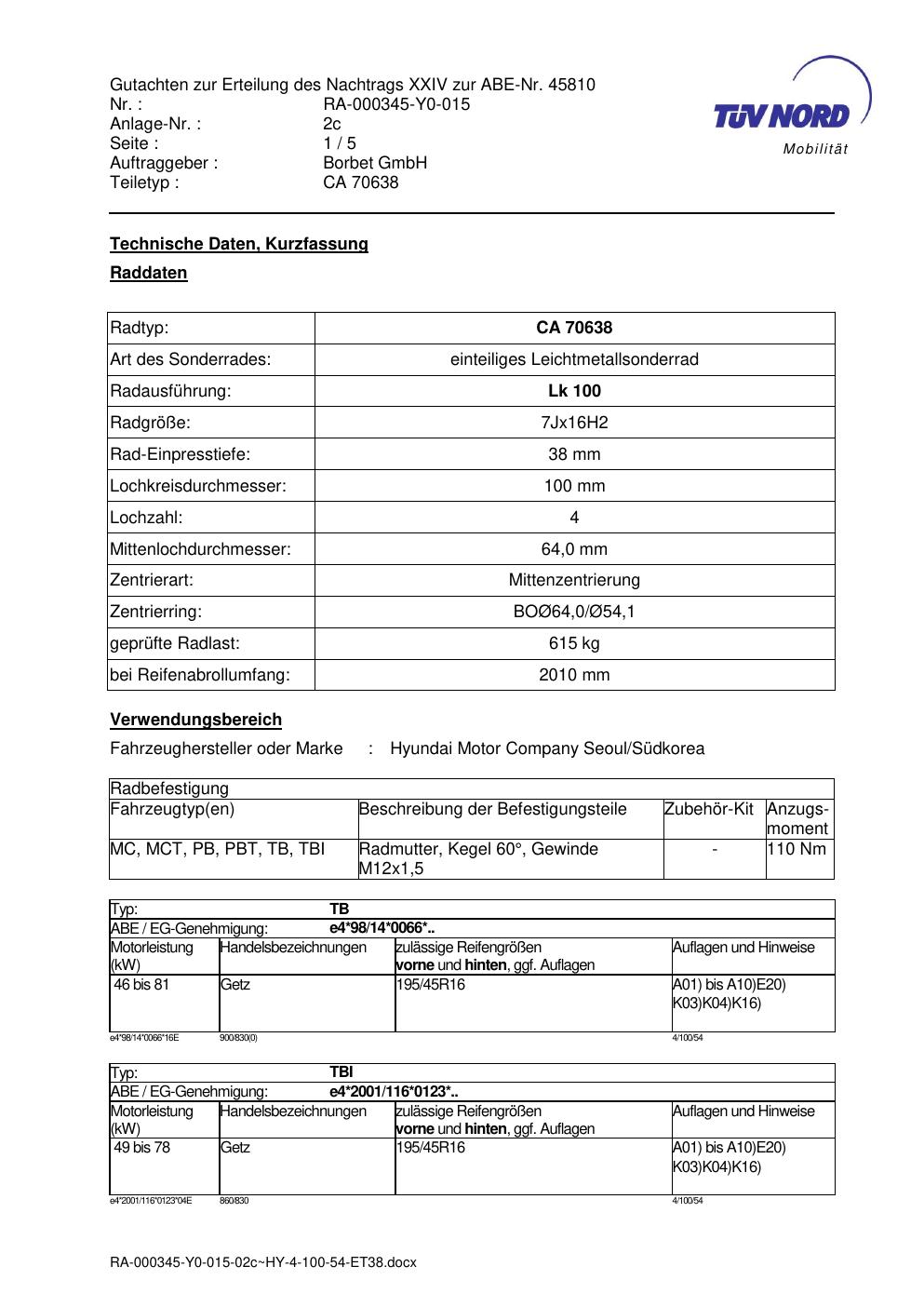 Dieses Gutachten (abe) bezieht sich auf die Alufelge Borbet CA 70638 in der Ausführung 7Jx16 ET 0, Mittenloch 0 mm (KBA 45810). Im PDF findest du typischerweise zulässige Reifengrößen, Auflagen/Anbauhinweise und – je nach Dokument – Hinweise zur Eintragung.