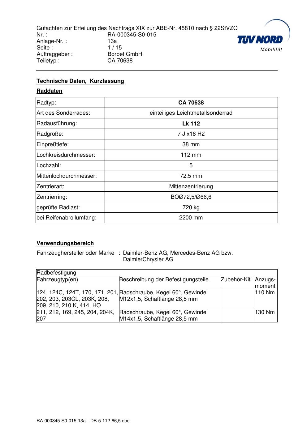 Dieses Gutachten (abe) bezieht sich auf die Alufelge brand-borbet CA 70638 in der Ausführung 7Jx16 ET 0, Mittenloch 0 mm (KBA 45810). Im PDF findest du typischerweise zulässige Reifengrößen, Auflagen/Anbauhinweise und – je nach Dokument – Hinweise zur Eintragung.