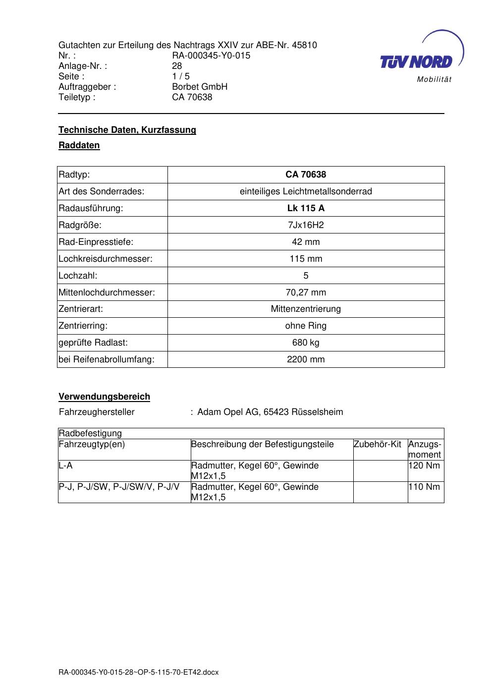 Dieses Gutachten (abe) bezieht sich auf die Alufelge Borbet CA 70638 in der Ausführung 7Jx16 ET 0, Mittenloch 0 mm (KBA 45810). Im PDF findest du typischerweise zulässige Reifengrößen, Auflagen/Anbauhinweise und – je nach Dokument – Hinweise zur Eintragung.