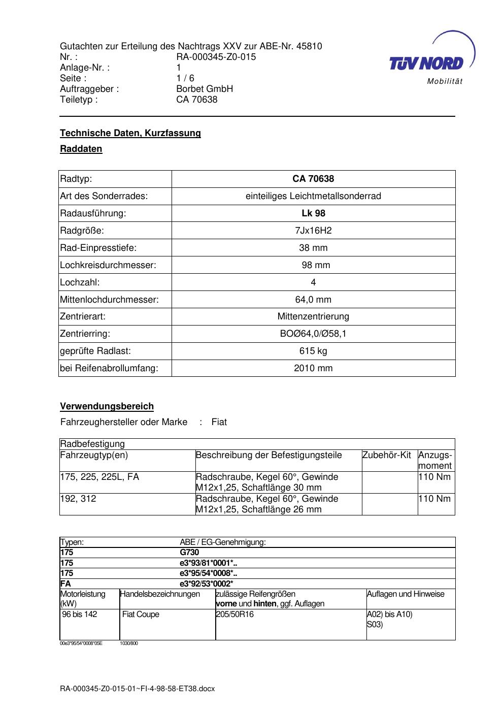 Dieses Gutachten (abe) bezieht sich auf die Alufelge Borbet CA 70638 in der Ausführung 7Jx16 ET 0, Mittenloch 0 mm (KBA 45810). Im PDF findest du typischerweise zulässige Reifengrößen, Auflagen/Anbauhinweise und – je nach Dokument – Hinweise zur Eintragung.