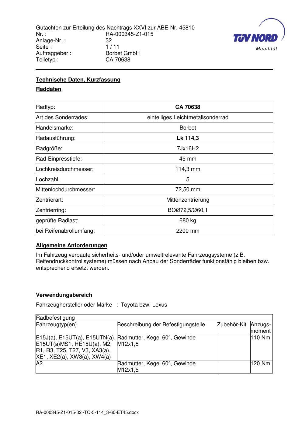 Dieses Gutachten (abe) bezieht sich auf die Alufelge Borbet CA 70638 in der Ausführung 7Jx16 ET 0, Mittenloch 0 mm (KBA 45810). Im PDF findest du typischerweise zulässige Reifengrößen, Auflagen/Anbauhinweise und – je nach Dokument – Hinweise zur Eintragung.