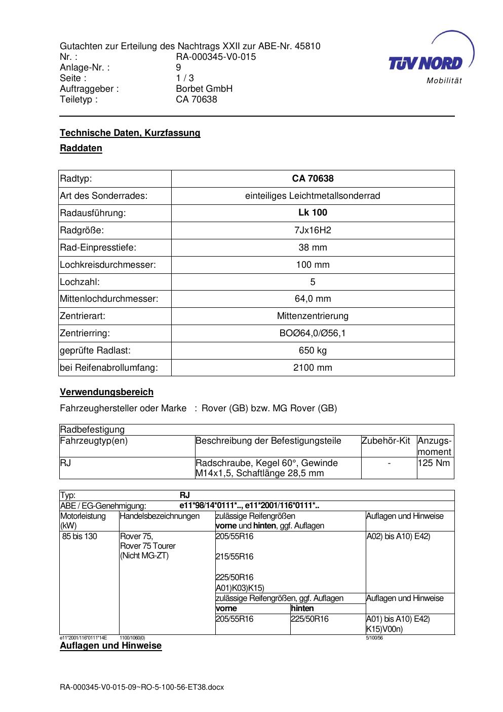 Dieses Gutachten (abe) bezieht sich auf die Alufelge Borbet CA 70638 in der Ausführung 7Jx16 ET 0, Mittenloch 0 mm (KBA 45810). Im PDF findest du typischerweise zulässige Reifengrößen, Auflagen/Anbauhinweise und – je nach Dokument – Hinweise zur Eintragung.