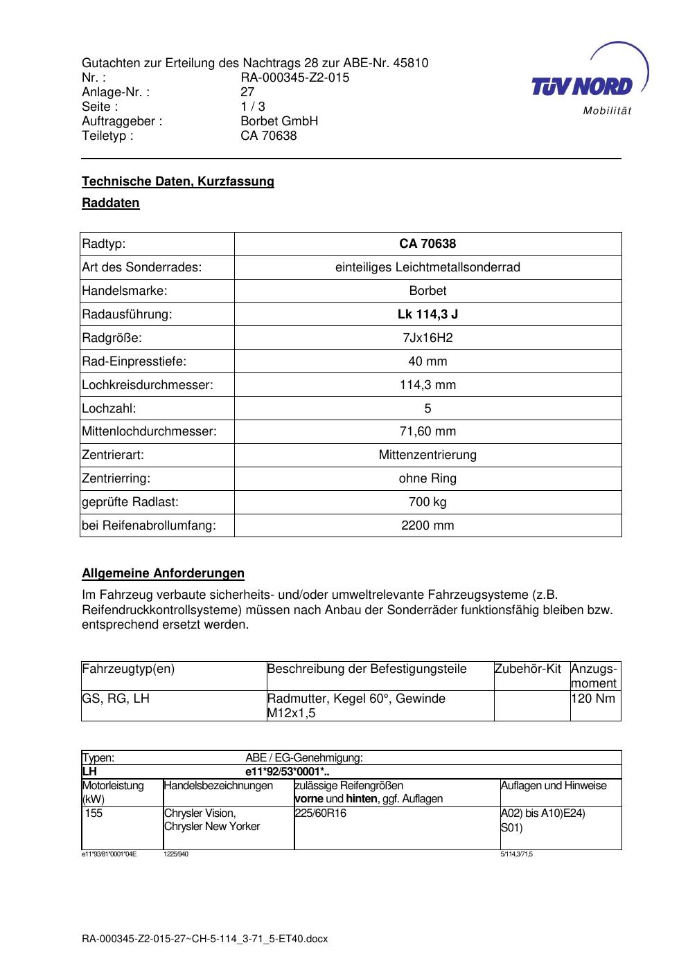 Dieses Gutachten (abe) bezieht sich auf die Alufelge Borbet CA 70638 in der Ausführung 7Jx16 ET 0, Mittenloch 0 mm (KBA 45810). Im PDF findest du typischerweise zulässige Reifengrößen, Auflagen/Anbauhinweise und – je nach Dokument – Hinweise zur Eintragung.