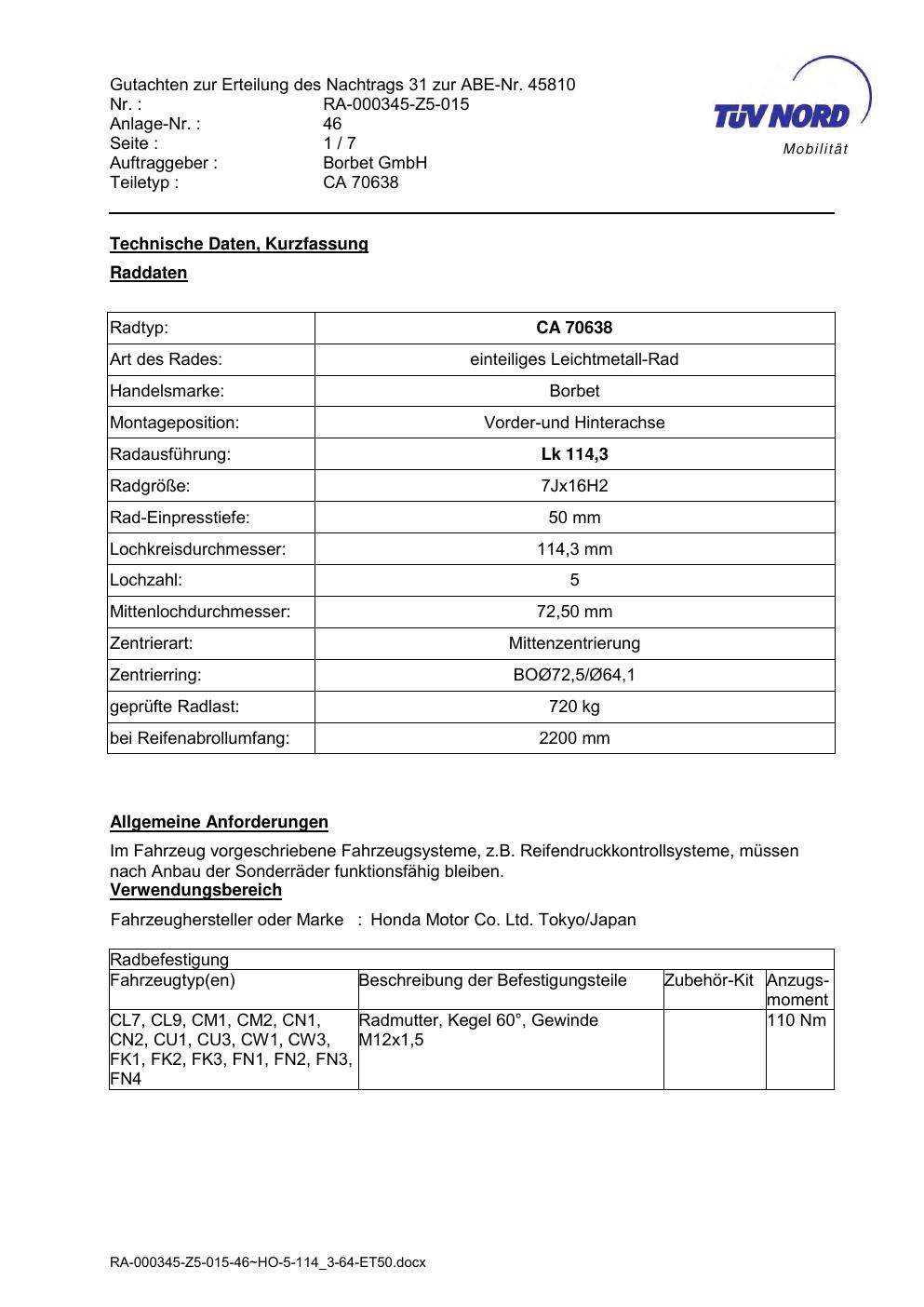 Dieses Gutachten (abe) bezieht sich auf die Alufelge Borbet CA 70638 in der Ausführung 7Jx16 ET 0, Mittenloch 0 mm (KBA 45810). Im PDF findest du typischerweise zulässige Reifengrößen, Auflagen/Anbauhinweise und – je nach Dokument – Hinweise zur Eintragung.