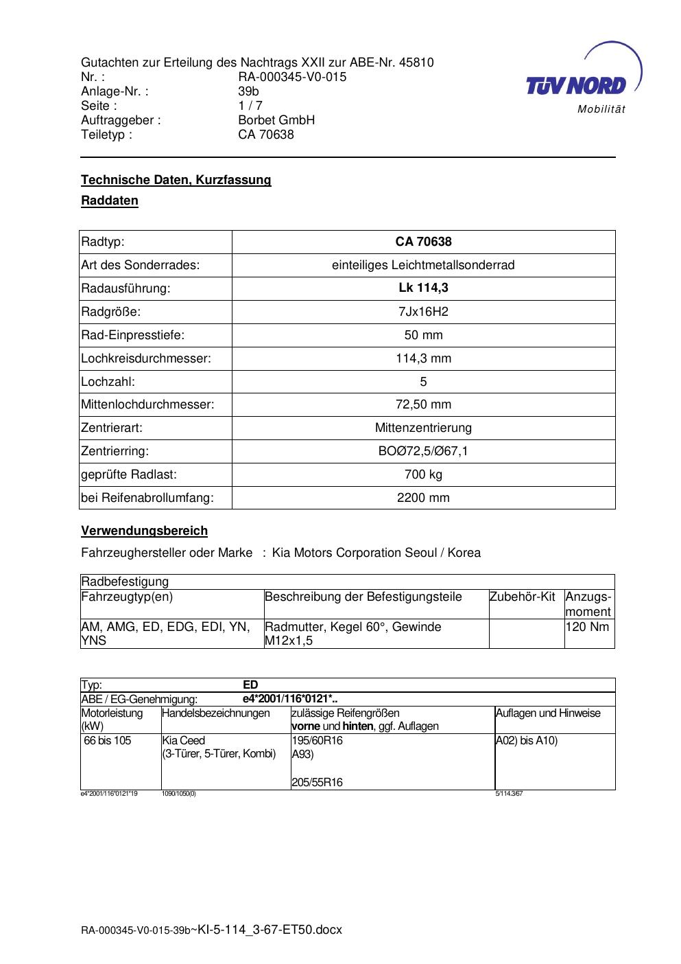 Dieses Gutachten (abe) bezieht sich auf die Alufelge Borbet CA 70638 in der Ausführung 7Jx16 ET 0, Mittenloch 0 mm (KBA 45810). Im PDF findest du typischerweise zulässige Reifengrößen, Auflagen/Anbauhinweise und – je nach Dokument – Hinweise zur Eintragung.