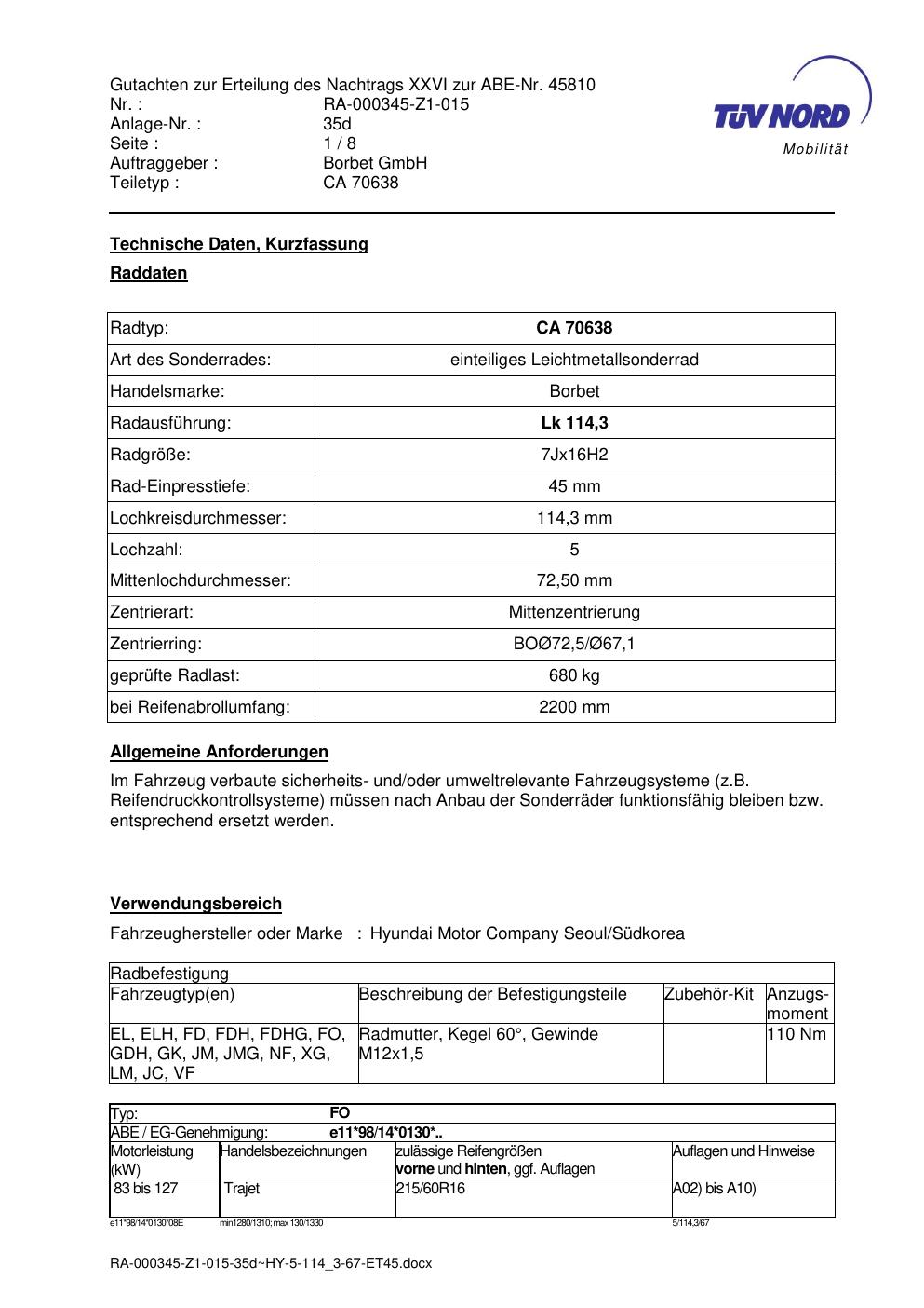 Dieses Gutachten (abe) bezieht sich auf die Alufelge Borbet CA 70638 in der Ausführung 7Jx16 ET 0, Mittenloch 0 mm (KBA 45810). Im PDF findest du typischerweise zulässige Reifengrößen, Auflagen/Anbauhinweise und – je nach Dokument – Hinweise zur Eintragung.