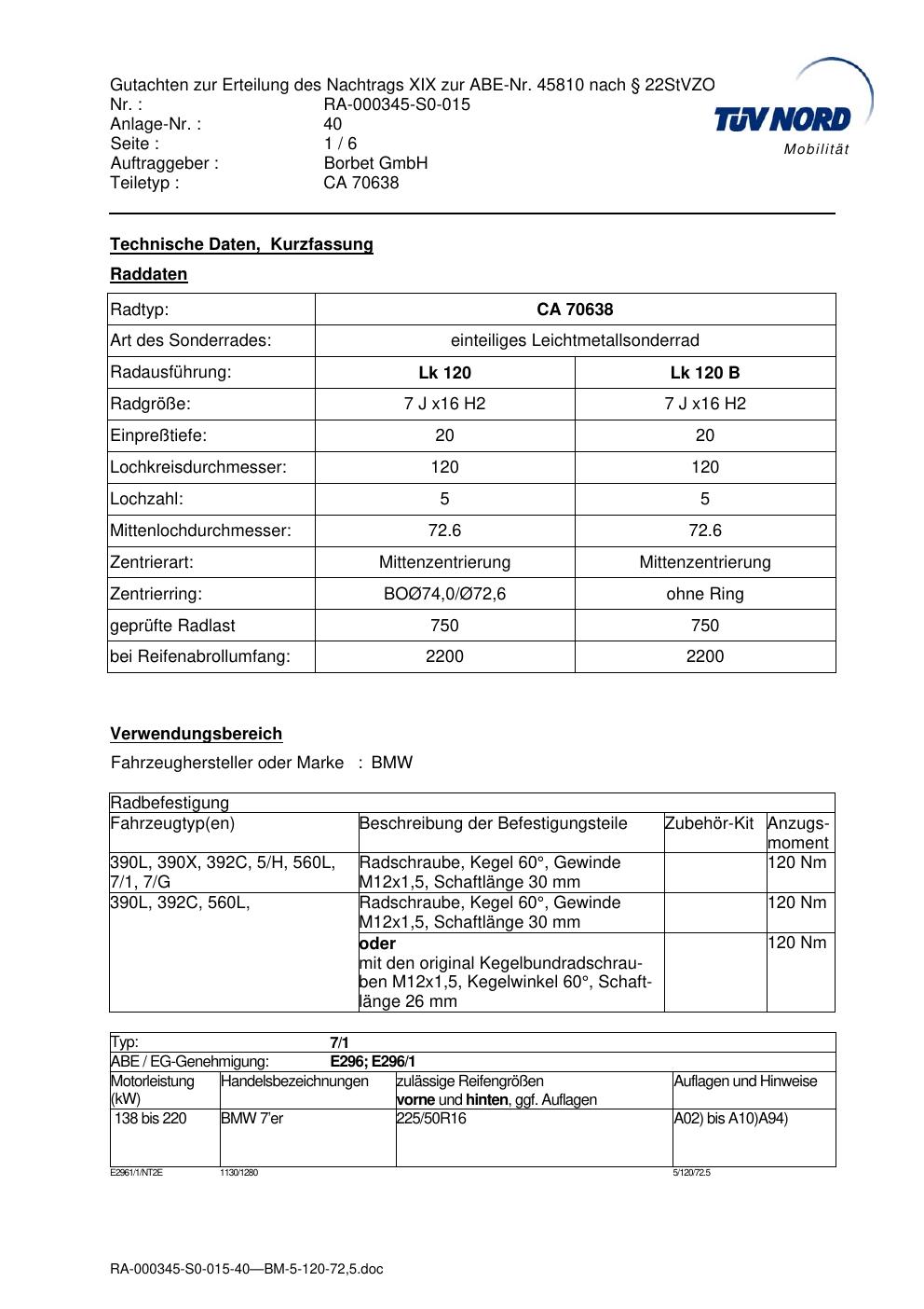 Dieses Gutachten (abe) bezieht sich auf die Alufelge Borbet CA 70638 in der Ausführung 7Jx16 ET 0, Mittenloch 0 mm (KBA 45810). Im PDF findest du typischerweise zulässige Reifengrößen, Auflagen/Anbauhinweise und – je nach Dokument – Hinweise zur Eintragung.