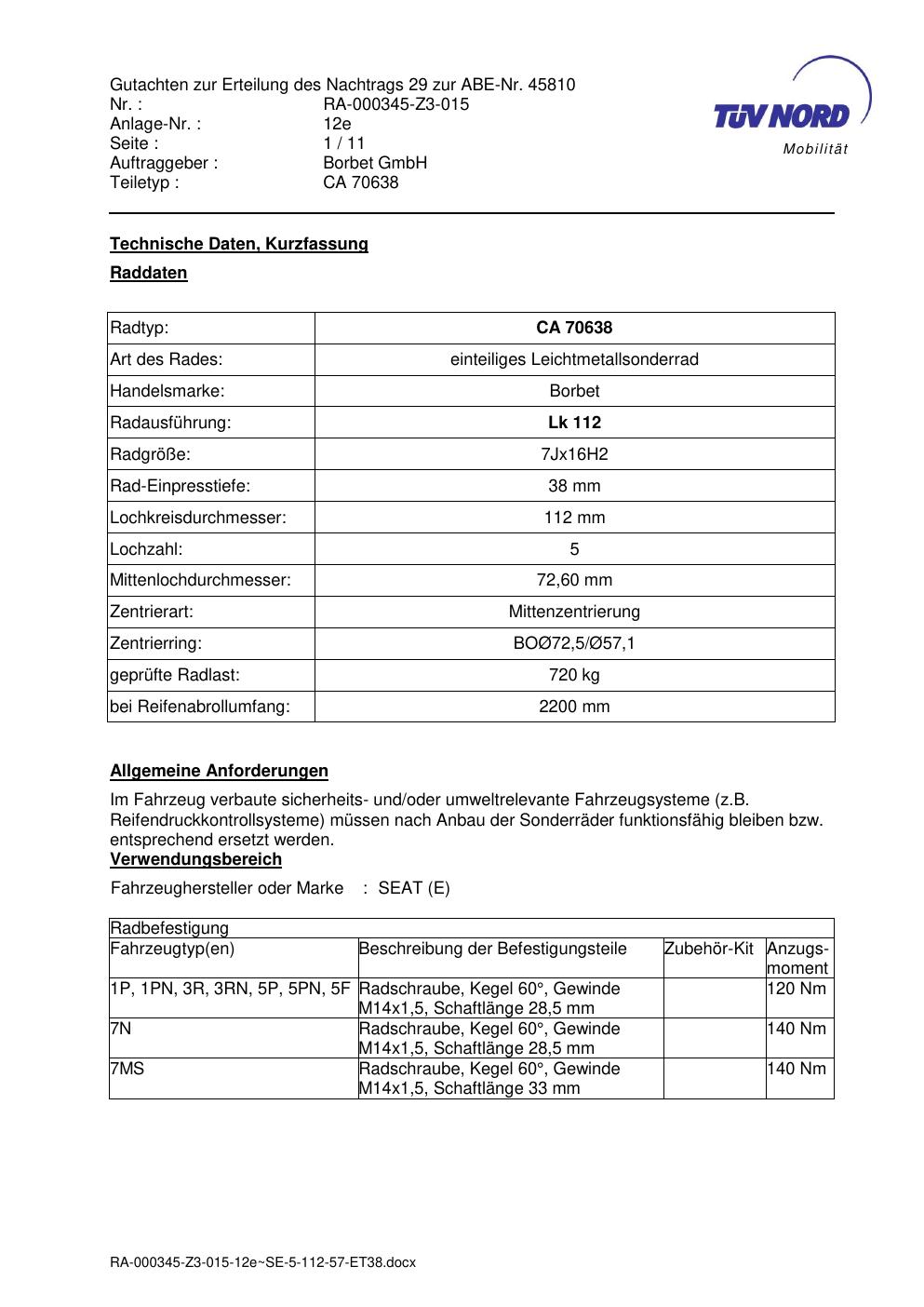 Dieses Gutachten (abe) bezieht sich auf die Alufelge Borbet CA 70638 in der Ausführung 7Jx16 ET 0, Mittenloch 0 mm (KBA 45810). Im PDF findest du typischerweise zulässige Reifengrößen, Auflagen/Anbauhinweise und – je nach Dokument – Hinweise zur Eintragung.