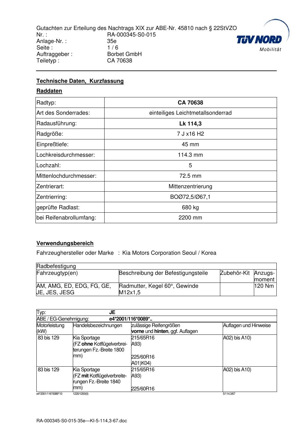 Dieses Gutachten (abe) bezieht sich auf die Alufelge brand-borbet CA 70638 in der Ausführung 7Jx16 ET 0, Mittenloch 0 mm (KBA 45810). Im PDF findest du typischerweise zulässige Reifengrößen, Auflagen/Anbauhinweise und – je nach Dokument – Hinweise zur Eintragung.