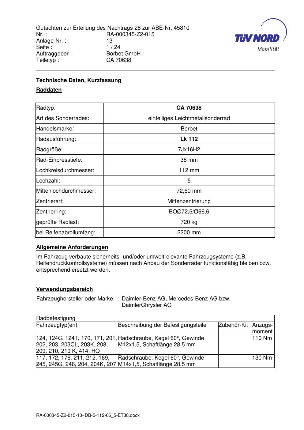 Dieses Gutachten (abe) bezieht sich auf die Alufelge Borbet CA 70638 in der Ausführung 7Jx16 ET 0, Mittenloch 0 mm (KBA 45810). Im PDF findest du typischerweise zulässige Reifengrößen, Auflagen/Anbauhinweise und – je nach Dokument – Hinweise zur Eintragung.