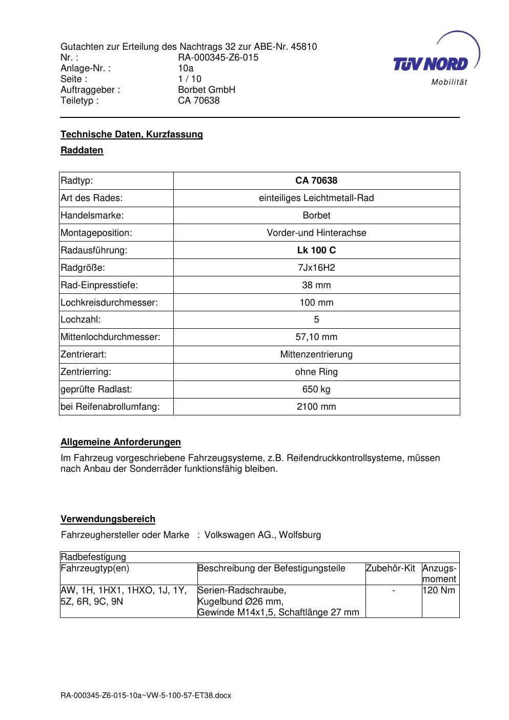 Dieses Gutachten (abe) bezieht sich auf die Alufelge Borbet CA 70638 in der Ausführung 7Jx16 ET 0, Mittenloch 0 mm (KBA 45810). Im PDF findest du typischerweise zulässige Reifengrößen, Auflagen/Anbauhinweise und – je nach Dokument – Hinweise zur Eintragung.