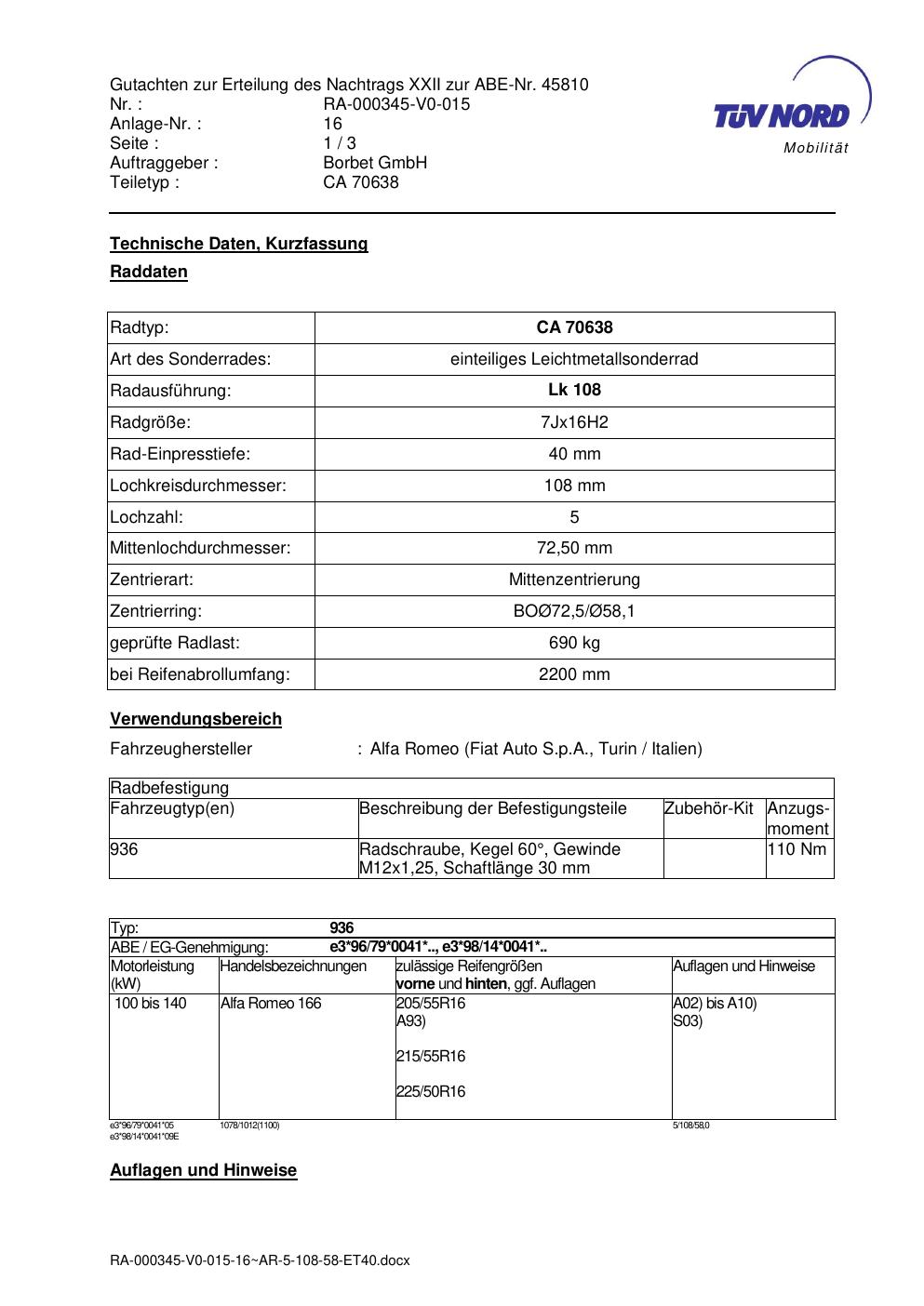 Dieses Gutachten (abe) bezieht sich auf die Alufelge Borbet CA 70638 in der Ausführung 7Jx16 ET 0, Mittenloch 0 mm (KBA 45810). Im PDF findest du typischerweise zulässige Reifengrößen, Auflagen/Anbauhinweise und – je nach Dokument – Hinweise zur Eintragung.