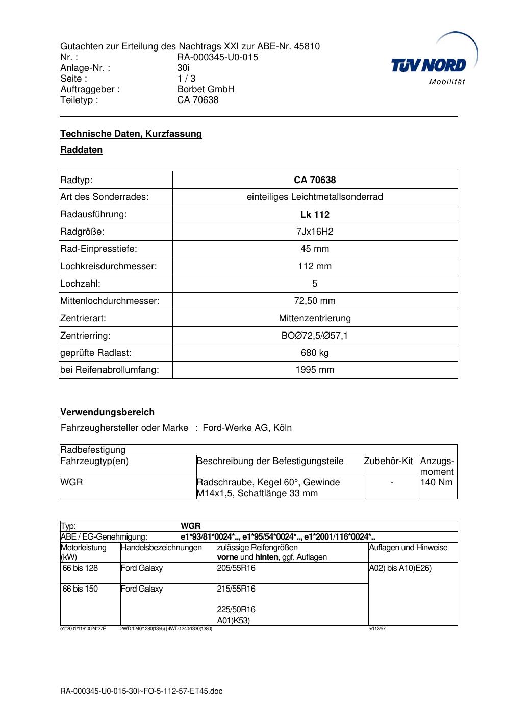 Dieses Gutachten (abe) bezieht sich auf die Alufelge Borbet CA 70638 in der Ausführung 7Jx16 ET 0, Mittenloch 0 mm (KBA 45810). Im PDF findest du typischerweise zulässige Reifengrößen, Auflagen/Anbauhinweise und – je nach Dokument – Hinweise zur Eintragung.