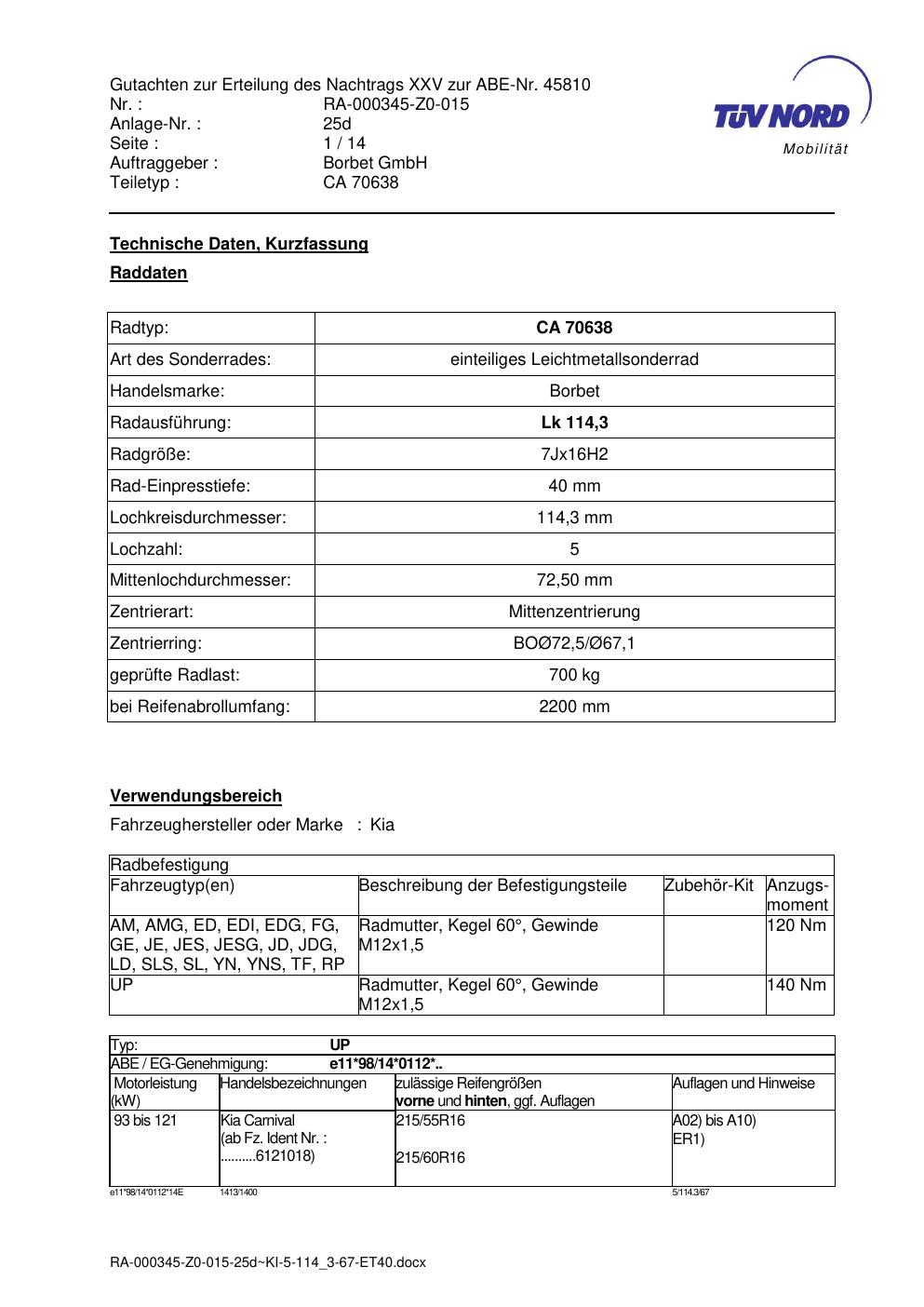 Dieses Gutachten (abe) bezieht sich auf die Alufelge Borbet CA 70638 in der Ausführung 7Jx16 ET 0, Mittenloch 0 mm (KBA 45810). Im PDF findest du typischerweise zulässige Reifengrößen, Auflagen/Anbauhinweise und – je nach Dokument – Hinweise zur Eintragung.