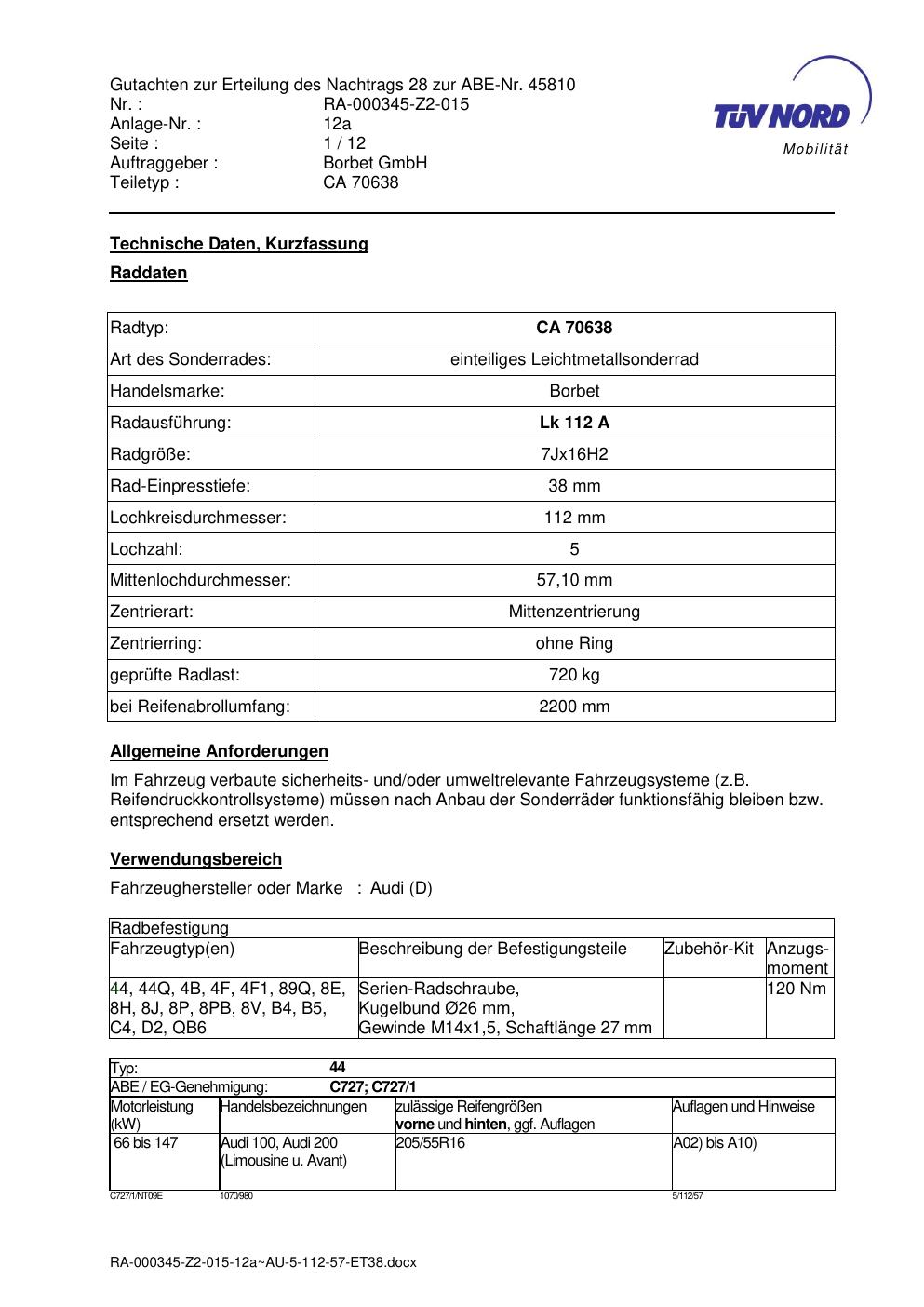 Dieses Gutachten (abe) bezieht sich auf die Alufelge Borbet CA 70638 in der Ausführung 7Jx16 ET 0, Mittenloch 0 mm (KBA 45810). Im PDF findest du typischerweise zulässige Reifengrößen, Auflagen/Anbauhinweise und – je nach Dokument – Hinweise zur Eintragung.