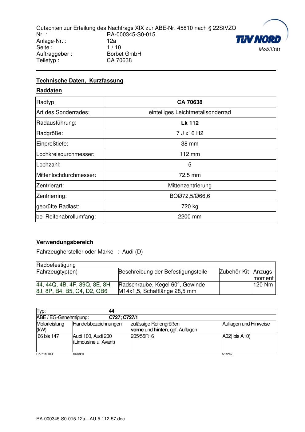 Dieses Gutachten (abe) bezieht sich auf die Alufelge Borbet CA 70638 in der Ausführung 7Jx16 ET 0, Mittenloch 0 mm (KBA 45810). Im PDF findest du typischerweise zulässige Reifengrößen, Auflagen/Anbauhinweise und – je nach Dokument – Hinweise zur Eintragung.
