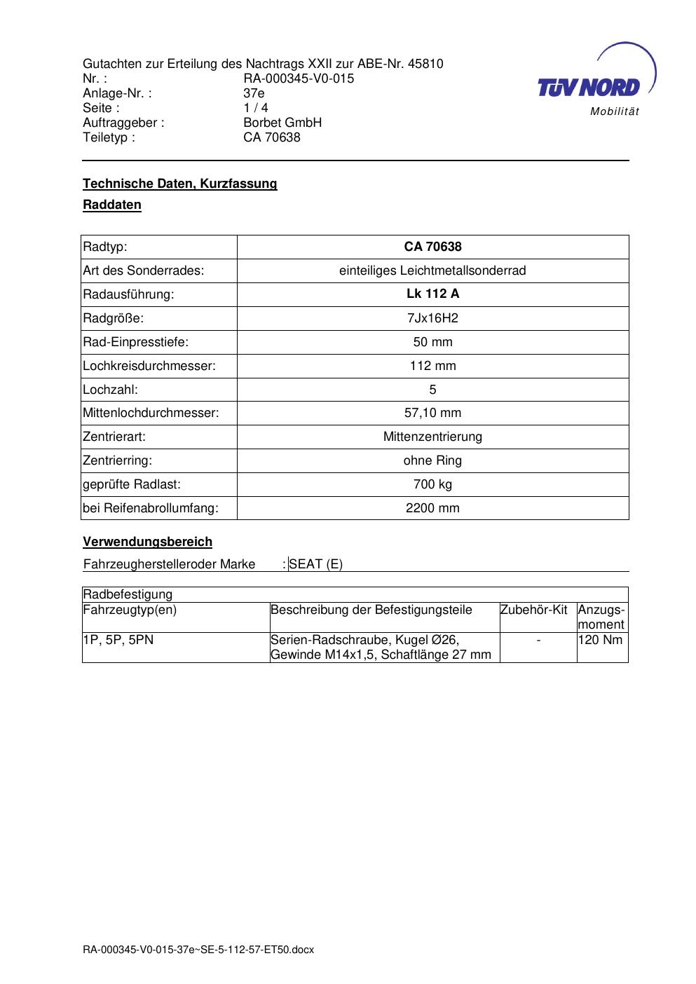 Dieses Gutachten (abe) bezieht sich auf die Alufelge Borbet CA 70638 in der Ausführung 7Jx16 ET 0, Mittenloch 0 mm (KBA 45810). Im PDF findest du typischerweise zulässige Reifengrößen, Auflagen/Anbauhinweise und – je nach Dokument – Hinweise zur Eintragung.