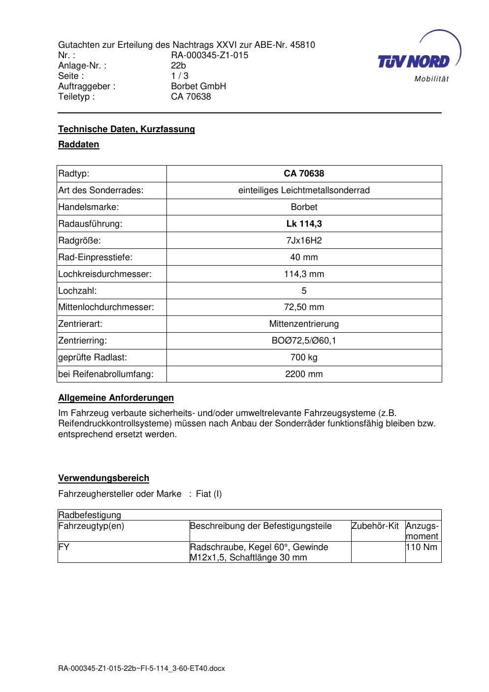 Dieses Gutachten (abe) bezieht sich auf die Alufelge Borbet CA 70638 in der Ausführung 7Jx16 ET 0, Mittenloch 0 mm (KBA 45810). Im PDF findest du typischerweise zulässige Reifengrößen, Auflagen/Anbauhinweise und – je nach Dokument – Hinweise zur Eintragung.