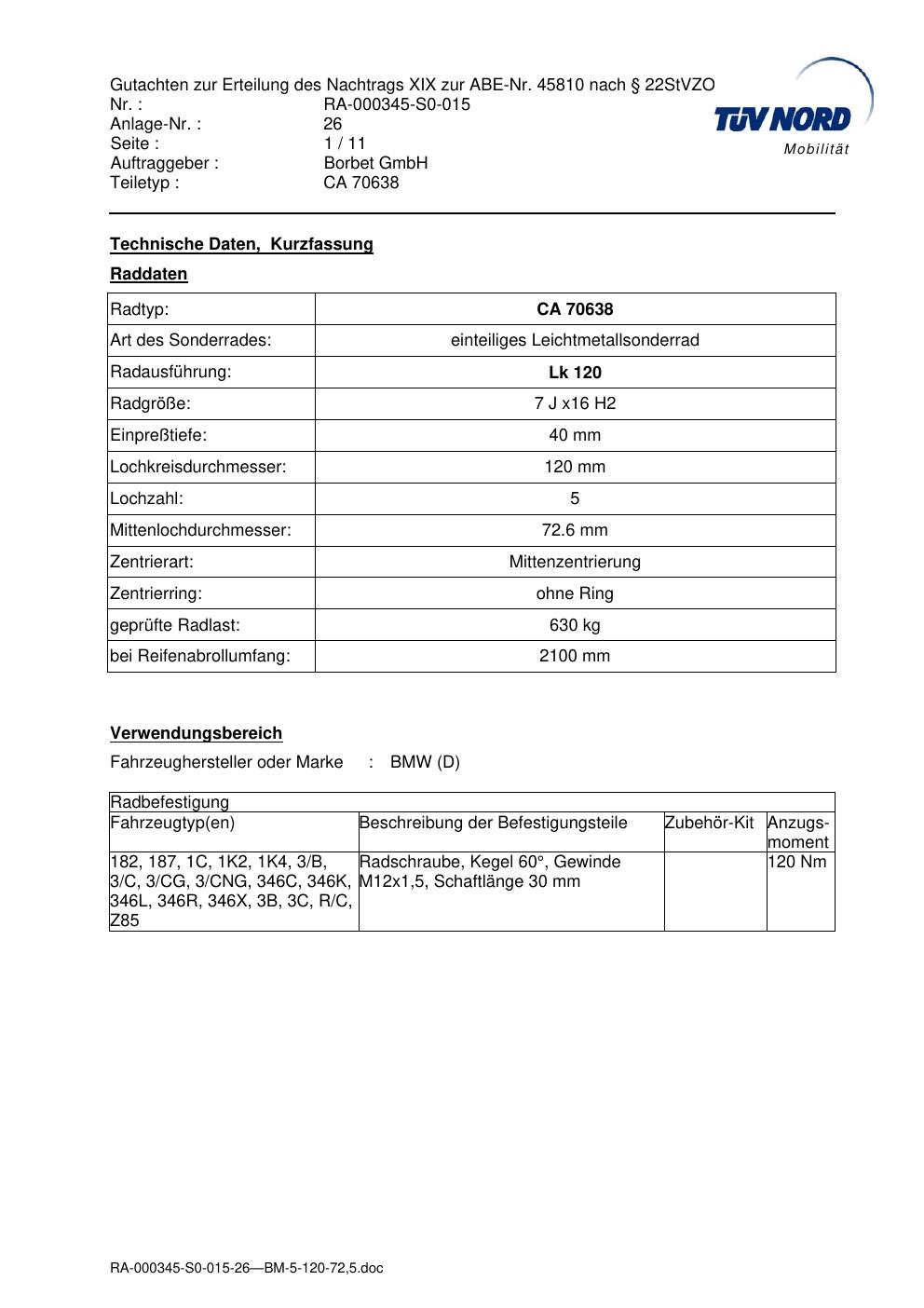Dieses Gutachten (abe) bezieht sich auf die Alufelge Borbet CA 70638 in der Ausführung 7Jx16 ET 0, Mittenloch 0 mm (KBA 45810). Im PDF findest du typischerweise zulässige Reifengrößen, Auflagen/Anbauhinweise und – je nach Dokument – Hinweise zur Eintragung.