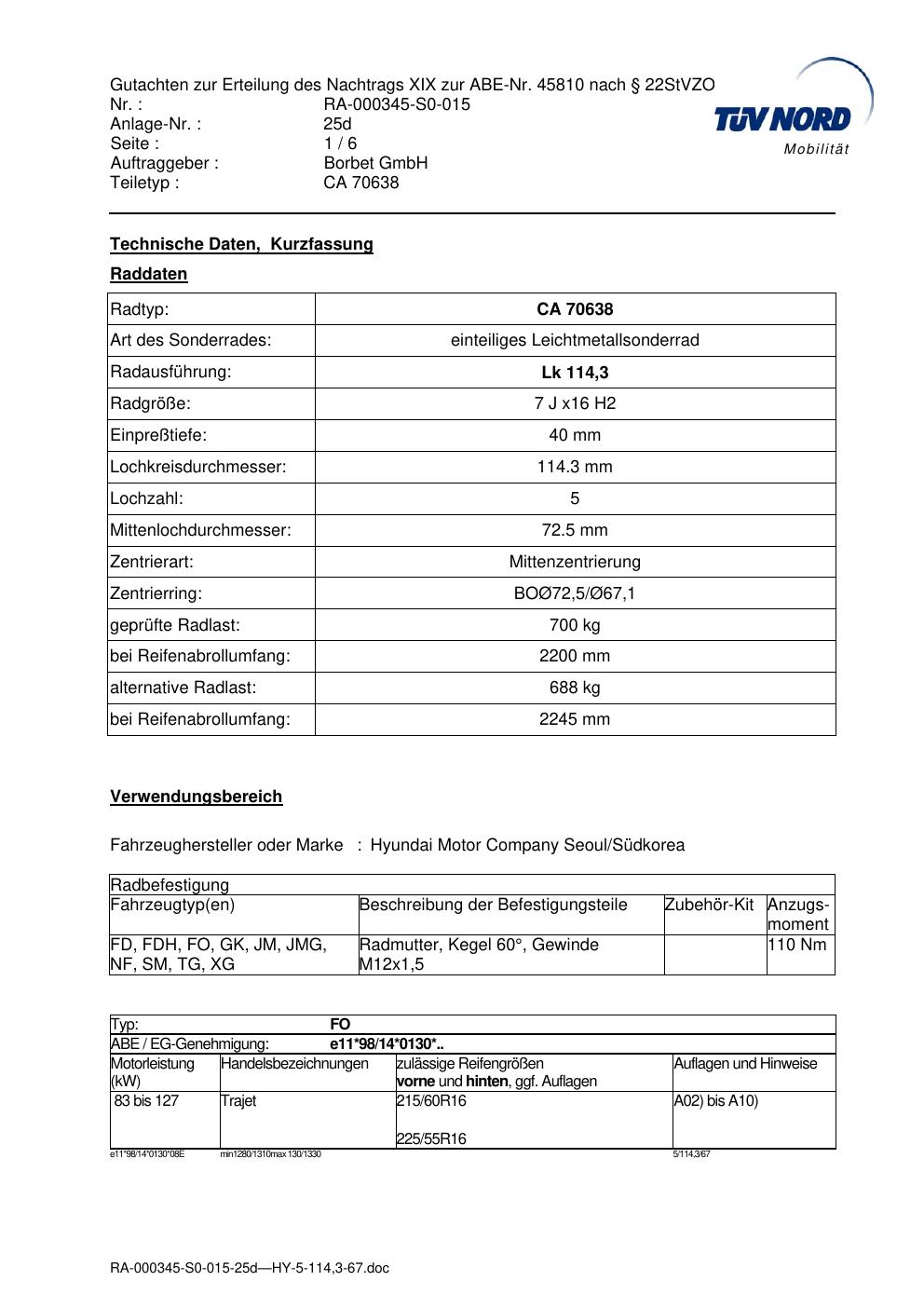Dieses Gutachten (abe) bezieht sich auf die Alufelge Borbet CA 70638 in der Ausführung 7Jx16 ET 0, Mittenloch 0 mm (KBA 45810). Im PDF findest du typischerweise zulässige Reifengrößen, Auflagen/Anbauhinweise und – je nach Dokument – Hinweise zur Eintragung.